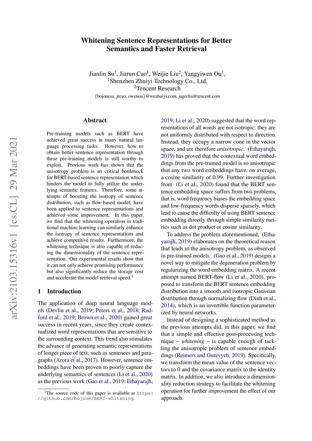 Pre-training models such as BERT have achieved great success in many natural language processing tasks. However, how to obtain better sentence representation through these pre-training models is still worthy to exploit. Previous work has shown that the anisotropy problem is an critical bottleneck for BERT-based sentence representation which hinders the model to fully utilize the underlying semantic features. Therefore, some attempts of boosting the isotropy of sentence distribution, such as flow-based model, have been applied to sentence representations and achieved some improvement. In this paper, we find that the whitening operation in traditional machine learning can similarly enhance the isotropy of sentence representations and achieve competitive results. Furthermore, the whitening technique is also capable of reducing the dimensionality of the sentence representation. Our experimental results show that it can not only achieve promising performance but also significantly reduce the storage cost and accelerate the model retrieval speed.