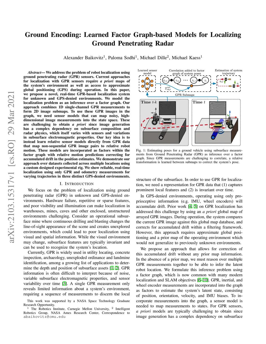 We address the problem of robot localization using ground penetrating radar (GPR) sensors. Current approaches for localization with GPR sensors require a priori maps of the system's environment as well as access to approximate global positioning (GPS) during operation. In this paper, we propose a novel, real-time GPR-based localization system for unknown and GPS-denied environments. We model the localization problem as an inference over a factor graph. Our approach combines 1D single-channel GPR measurements to form 2D image submaps. To use these GPR images in the graph, we need sensor models that can map noisy, high-dimensional image measurements into the state space. These are challenging to obtain a priori since image generation has a complex dependency on subsurface composition and radar physics, which itself varies with sensors and variations in subsurface electromagnetic properties. Our key idea is to instead learn relative sensor models directly from GPR data that map non-sequential GPR image pairs to relative robot motion. These models are incorporated as factors within the factor graph with relative motion predictions correcting for accumulated drift in the position estimates. We demonstrate our approach over datasets collected across multiple locations using a custom designed experimental rig. We show reliable, real-time localization using only GPR and odometry measurements for varying trajectories in three distinct GPS-denied environments. For our supplementary video, see https://youtu.be/HXXgdTJzqyw.