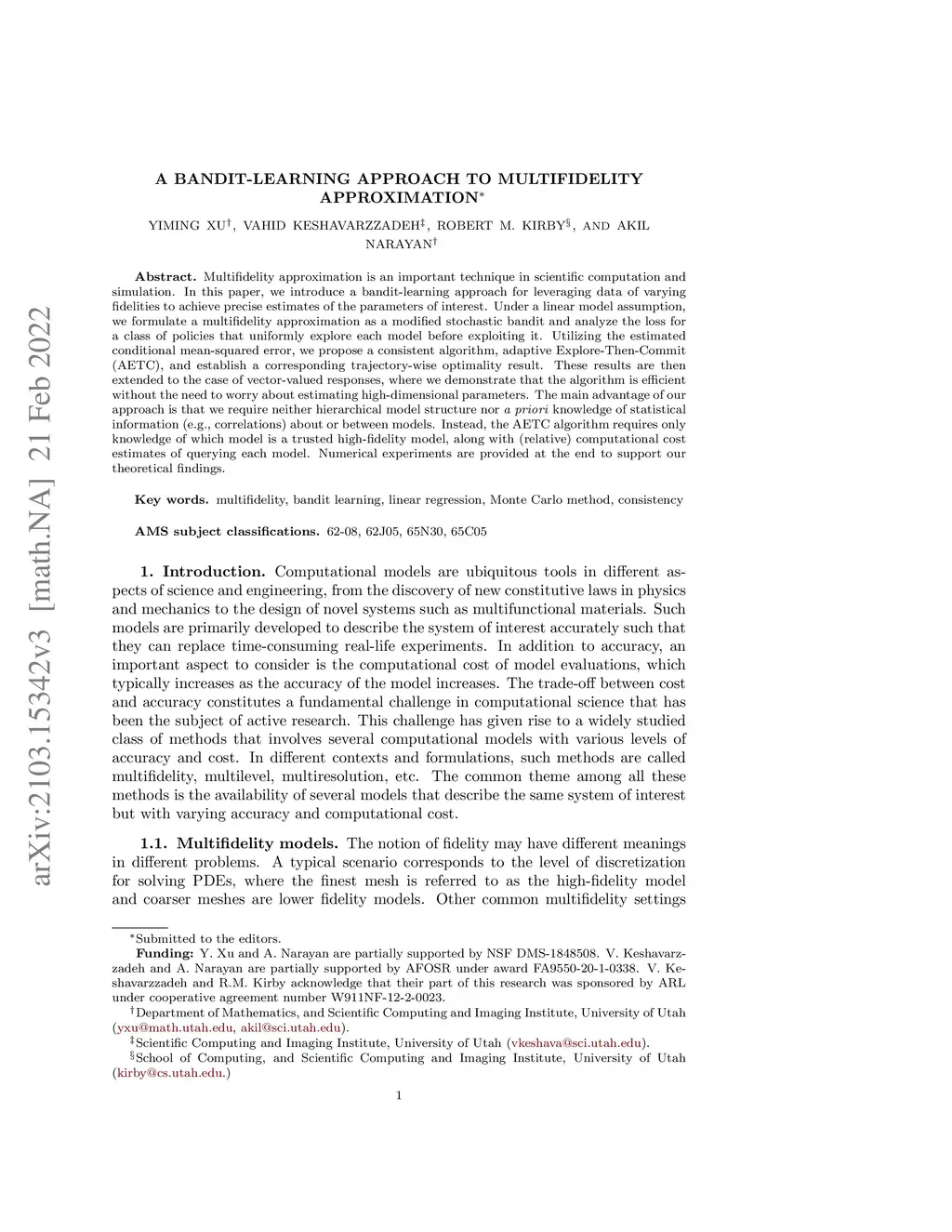 Multifidelity approximation is an important technique in scientific computation and simulation. In this paper, we introduce a bandit-learning approach for leveraging data of varying fidelities to achieve precise estimates of the parameters of interest. Under a linear model assumption, we formulate a multifidelity approximation as a modified stochastic bandit, and analyze the loss for a class of policies that uniformly explore each model before exploiting. Utilizing the estimated conditional mean-squared error, we propose a consistent algorithm, adaptive Explore-Then-Commit (AETC), and establish a corresponding trajectory-wise optimality result. These results are then extended to the case of vector-valued responses, where we demonstrate that the algorithm is efficient without the need to worry about estimating high-dimensional parameters. The main advantage of our approach is that we require neither hierarchical model structure nor \textit{a priori} knowledge of statistical information (e.g., correlations) about or between models. Instead, the AETC algorithm requires only knowledge of which model is a trusted high-fidelity model, along with (relative) computational cost estimates of querying each model. Numerical experiments are provided at the end to support our theoretical findings.