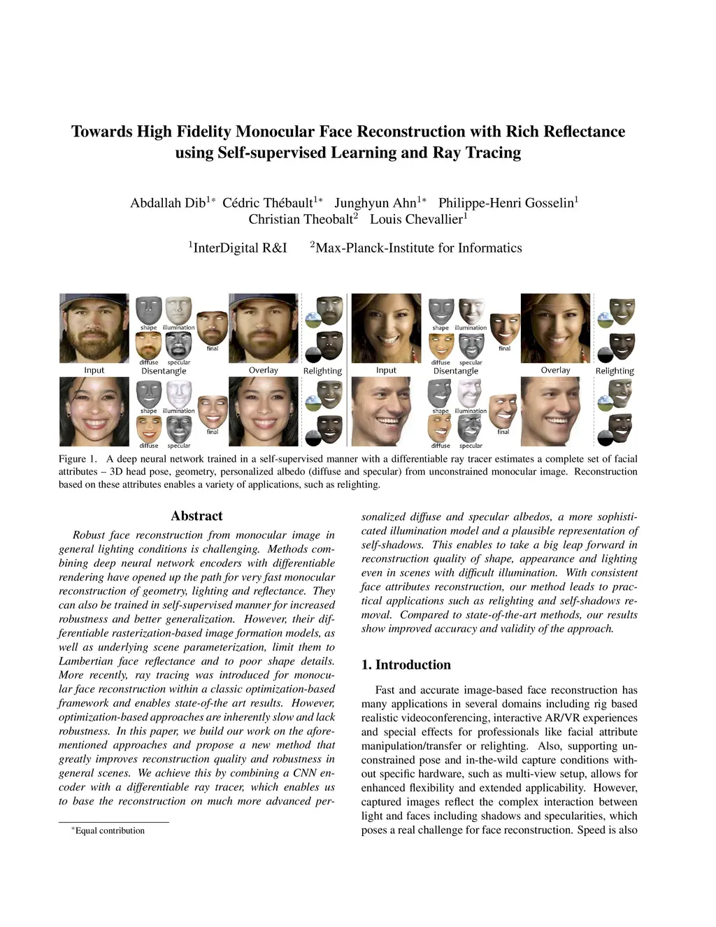 Robust face reconstruction from monocular image in general lighting conditions is challenging. Methods combining deep neural network encoders with differentiable rendering have opened up the path for very fast monocular reconstruction of geometry, lighting and reflectance. They can also be trained in self-supervised manner for increased robustness and better generalization. However, their differentiable rasterization based image formation models, as well as underlying scene parameterization, limit them to Lambertian face reflectance and to poor shape details. More recently, ray tracing was introduced for monocular face reconstruction within a classic optimization-based framework and enables state-of-the art results. However optimization-based approaches are inherently slow and lack robustness. In this paper, we build our work on the aforementioned approaches and propose a new method that greatly improves reconstruction quality and robustness in general scenes. We achieve this by combining a CNN encoder with a differentiable ray tracer, which enables us to base the reconstruction on much more advanced personalized diffuse and specular albedos, a more sophisticated illumination model and a plausible representation of self-shadows. This enables to take a big leap forward in reconstruction quality of shape, appearance and lighting even in scenes with difficult illumination. With consistent face attributes reconstruction, our method leads to practical applications such as relighting and self-shadows removal. Compared to state-of-the-art methods, our results show improved accuracy and validity of the approach.
