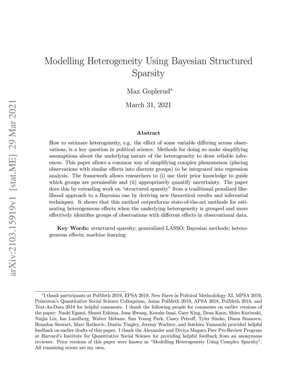 How to estimate heterogeneity, e.g. the effect of some variable differing across observations, is a key question in political science. Methods for doing so make simplifying assumptions about the underlying nature of the heterogeneity to draw reliable inferences. This paper allows a common way of simplifying complex phenomenon (placing observations with similar effects into discrete groups) to be integrated into regression analysis. The framework allows researchers to (i) use their prior knowledge to guide which groups are permissible and (ii) appropriately quantify uncertainty. The paper does this by extending work on "structured sparsity" from a traditional penalized likelihood approach to a Bayesian one by deriving new theoretical results and inferential techniques. It shows that this method outperforms state-of-the-art methods for estimating heterogeneous effects when the underlying heterogeneity is grouped and more effectively identifies groups of observations with different effects in observational data.