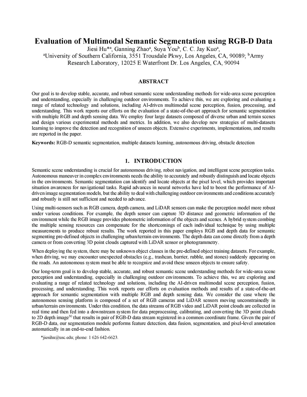 Our goal is to develop stable, accurate, and robust semantic scene understanding methods for wide-area scene perception and understanding, especially in challenging outdoor environments. To achieve this, we are exploring and evaluating a range of related technology and solutions, including AI-driven multimodal scene perception, fusion, processing, and understanding. This work reports our efforts on the evaluation of a state-of-the-art approach for semantic segmentation with multiple RGB and depth sensing data. We employ four large datasets composed of diverse urban and terrain scenes and design various experimental methods and metrics. In addition, we also develop new strategies of multi-datasets learning to improve the detection and recognition of unseen objects. Extensive experiments, implementations, and results are reported in the paper.