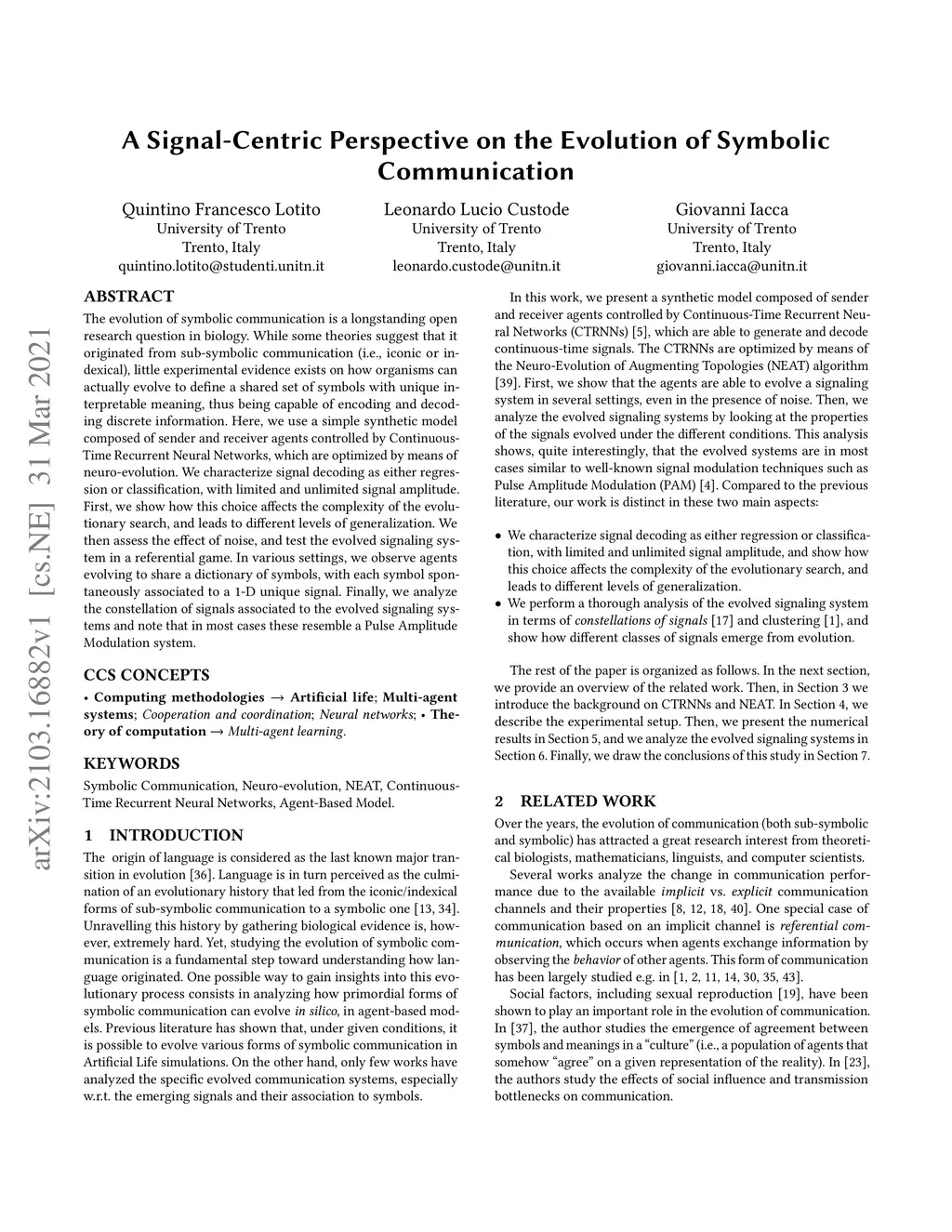 The evolution of symbolic communication is a longstanding open research question in biology. While some theories suggest that it originated from sub-symbolic communication (i.e., iconic or indexical), little experimental evidence exists on how organisms can actually evolve to define a shared set of symbols with unique interpretable meaning, thus being capable of encoding and decoding discrete information. Here, we use a simple synthetic model composed of sender and receiver agents controlled by Continuous-Time Recurrent Neural Networks, which are optimized by means of neuro-evolution. We characterize signal decoding as either regression or classification, with limited and unlimited signal amplitude. First, we show how this choice affects the complexity of the evolutionary search, and leads to different levels of generalization. We then assess the effect of noise, and test the evolved signaling system in a referential game. In various settings, we observe agents evolving to share a dictionary of symbols, with each symbol spontaneously associated to a 1-D unique signal. Finally, we analyze the constellation of signals associated to the evolved signaling systems and note that in most cases these resemble a Pulse Amplitude Modulation system.
