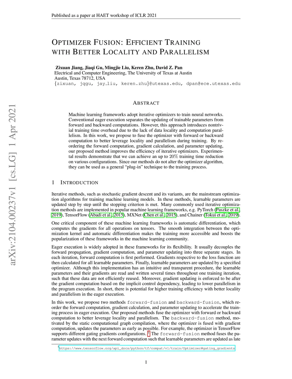 Machine learning frameworks adopt iterative optimizers to train neural networks. Conventional eager execution separates the updating of trainable parameters from forward and backward computations. However, this approach introduces nontrivial training time overhead due to the lack of data locality and computation parallelism. In this work, we propose to fuse the optimizer with forward or backward computation to better leverage locality and parallelism during training. By reordering the forward computation, gradient calculation, and parameter updating, our proposed method improves the efficiency of iterative optimizers. Experimental results demonstrate that we can achieve an up to 20% training time reduction on various configurations. Since our methods do not alter the optimizer algorithm, they can be used as a general "plug-in" technique to the training process.
