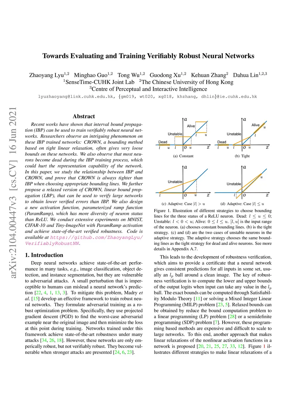 Recent works have shown that interval bound propagation (IBP) can be used to train verifiably robust neural networks. Reseachers observe an intriguing phenomenon on these IBP trained networks: CROWN, a bounding method based on tight linear relaxation, often gives very loose bounds on these networks. We also observe that most neurons become dead during the IBP training process, which could hurt the representation capability of the network. In this paper, we study the relationship between IBP and CROWN, and prove that CROWN is always tighter than IBP when choosing appropriate bounding lines. We further propose a relaxed version of CROWN, linear bound propagation (LBP), that can be used to verify large networks to obtain lower verified errors than IBP. We also design a new activation function, parameterized ramp function (ParamRamp), which has more diversity of neuron status than ReLU. We conduct extensive experiments on MNIST, CIFAR-10 and Tiny-ImageNet with ParamRamp activation and achieve state-of-the-art verified robustness. Code and the appendix are available at https://github.com/ZhaoyangLyu/VerifiablyRobustNN.