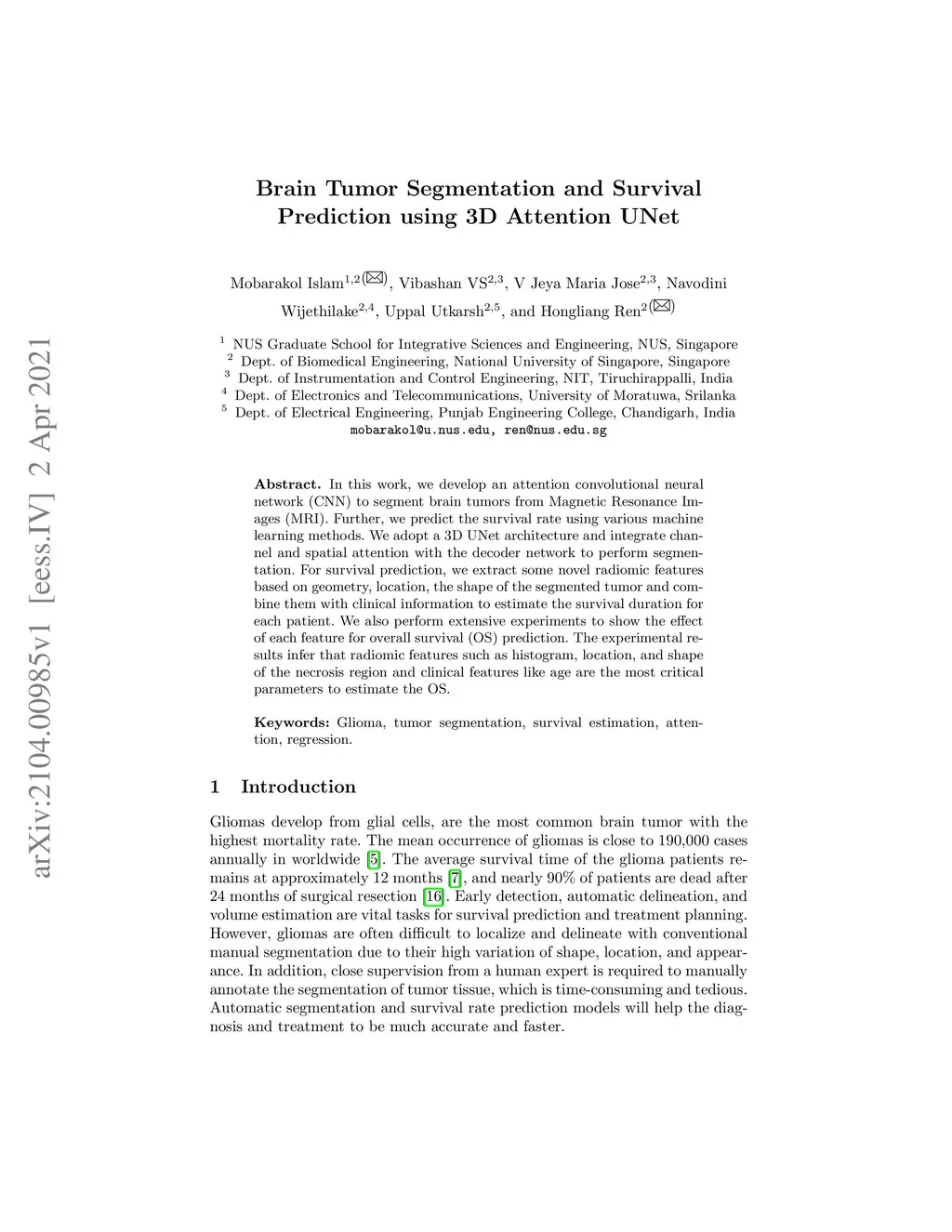 In this work, we develop an attention convolutional neural network (CNN) to segment brain tumors from Magnetic Resonance Images (MRI). Further, we predict the survival rate using various machine learning methods. We adopt a 3D UNet architecture and integrate channel and spatial attention with the decoder network to perform segmentation. For survival prediction, we extract some novel radiomic features based on geometry, location, the shape of the segmented tumor and combine them with clinical information to estimate the survival duration for each patient. We also perform extensive experiments to show the effect of each feature for overall survival (OS) prediction. The experimental results infer that radiomic features such as histogram, location, and shape of the necrosis region and clinical features like age are the most critical parameters to estimate the OS.