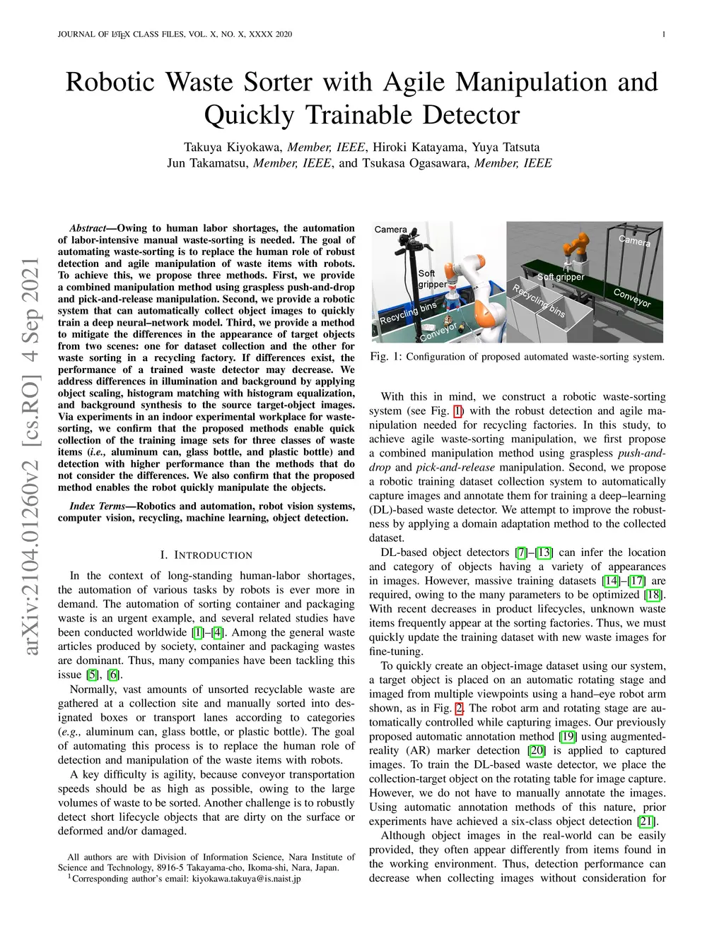 Owing to human labor shortages, the automation of labor-intensive manual waste-sorting is needed. The goal of automating waste-sorting is to replace the human role of robust detection and agile manipulation of waste items with robots. To achieve this, we propose three methods. First, we provide a combined manipulation method using graspless push-and-drop and pick-and-release manipulation. Second, we provide a robotic system that can automatically collect object images to quickly train a deep neural-network model. Third, we provide a method to mitigate the differences in the appearance of target objects from two scenes: one for dataset collection and the other for waste sorting in a recycling factory. If differences exist, the performance of a trained waste detector may decrease. We address differences in illumination and background by applying object scaling, histogram matching with histogram equalization, and background synthesis to the source target-object images. Via experiments in an indoor experimental workplace for waste-sorting, we confirm that the proposed methods enable quick collection of the training image sets for three classes of waste items (i.e., aluminum can, glass bottle, and plastic bottle) and detection with higher performance than the methods that do not consider the differences. We also confirm that the proposed method enables the robot quickly manipulate the objects.