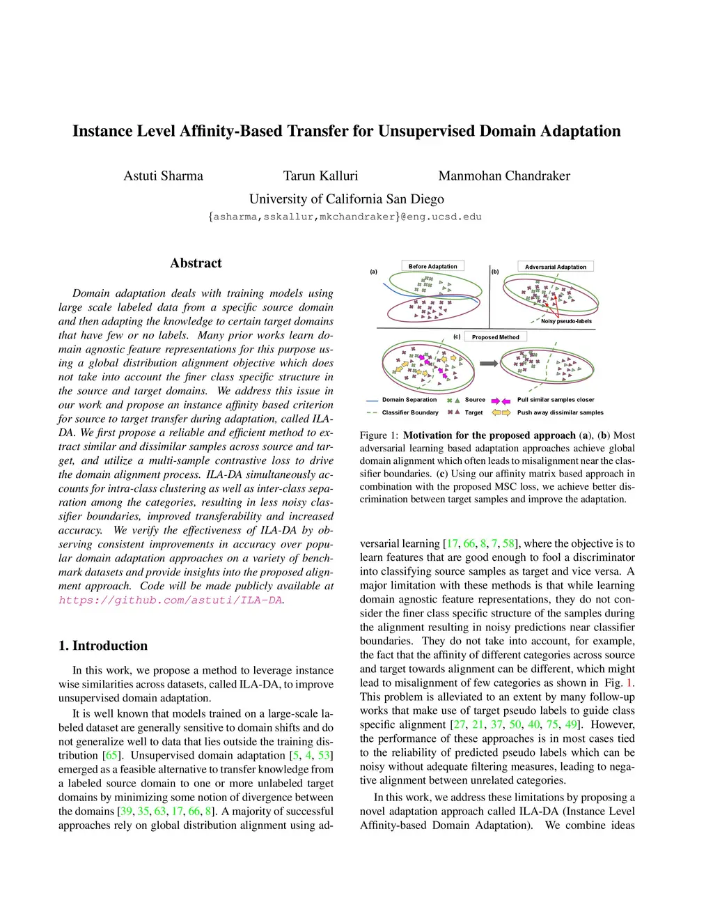 Domain adaptation deals with training models using large scale labeled data from a specific source domain and then adapting the knowledge to certain target domains that have few or no labels. Many prior works learn domain agnostic feature representations for this purpose using a global distribution alignment objective which does not take into account the finer class specific structure in the source and target domains. We address this issue in our work and propose an instance affinity based criterion for source to target transfer during adaptation, called ILA-DA. We first propose a reliable and efficient method to extract similar and dissimilar samples across source and target, and utilize a multi-sample contrastive loss to drive the domain alignment process. ILA-DA simultaneously accounts for intra-class clustering as well as inter-class separation among the categories, resulting in less noisy classifier boundaries, improved transferability and increased accuracy. We verify the effectiveness of ILA-DA by observing consistent improvements in accuracy over popular domain adaptation approaches on a variety of benchmark datasets and provide insights into the proposed alignment approach. Code will be made publicly available at https://github.com/astuti/ILA-DA.