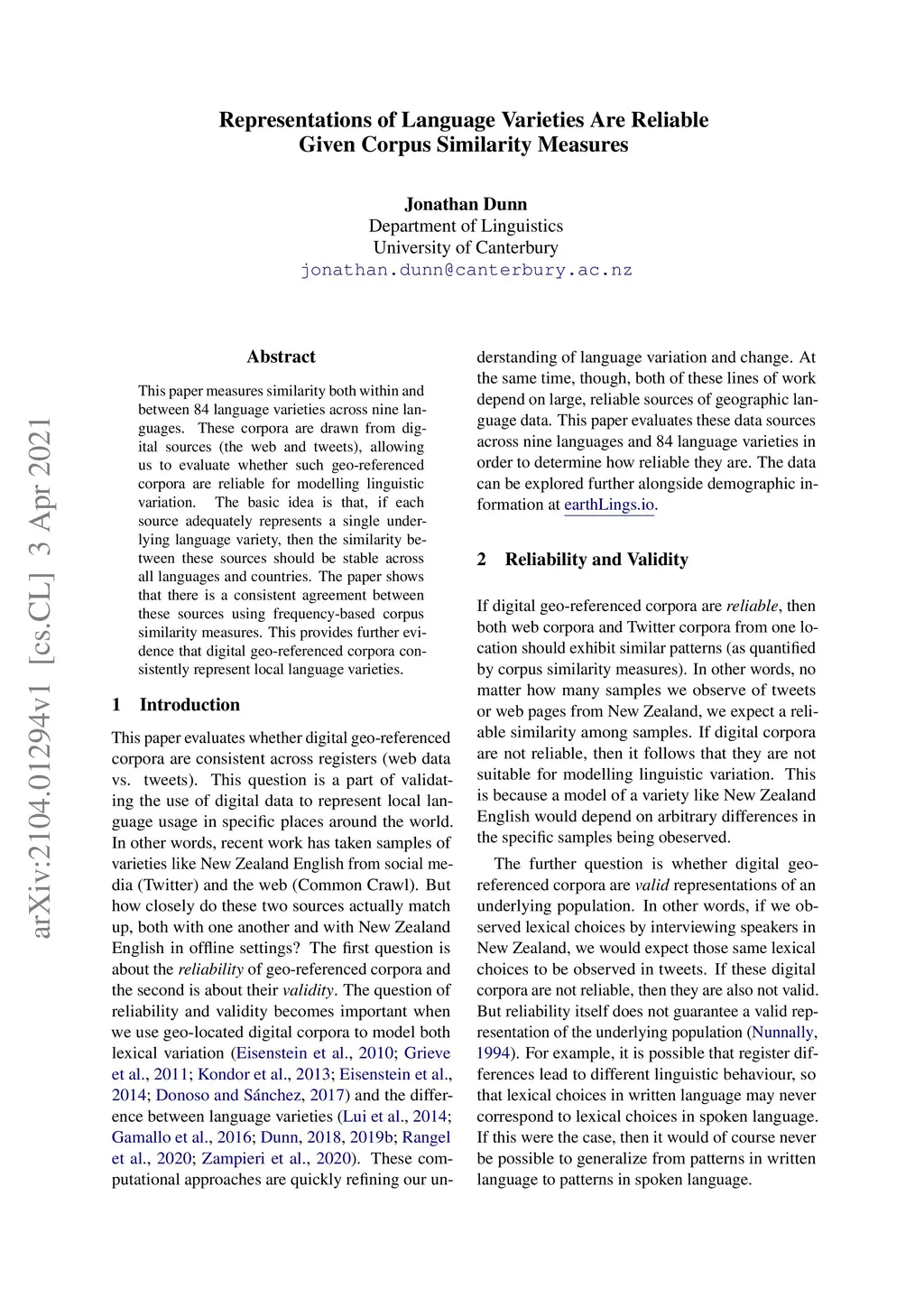 This paper measures similarity both within and between 84 language varieties across nine languages. These corpora are drawn from digital sources (the web and tweets), allowing us to evaluate whether such geo-referenced corpora are reliable for modelling linguistic variation. The basic idea is that, if each source adequately represents a single underlying language variety, then the similarity between these sources should be stable across all languages and countries. The paper shows that there is a consistent agreement between these sources using frequency-based corpus similarity measures. This provides further evidence that digital geo-referenced corpora consistently represent local language varieties.