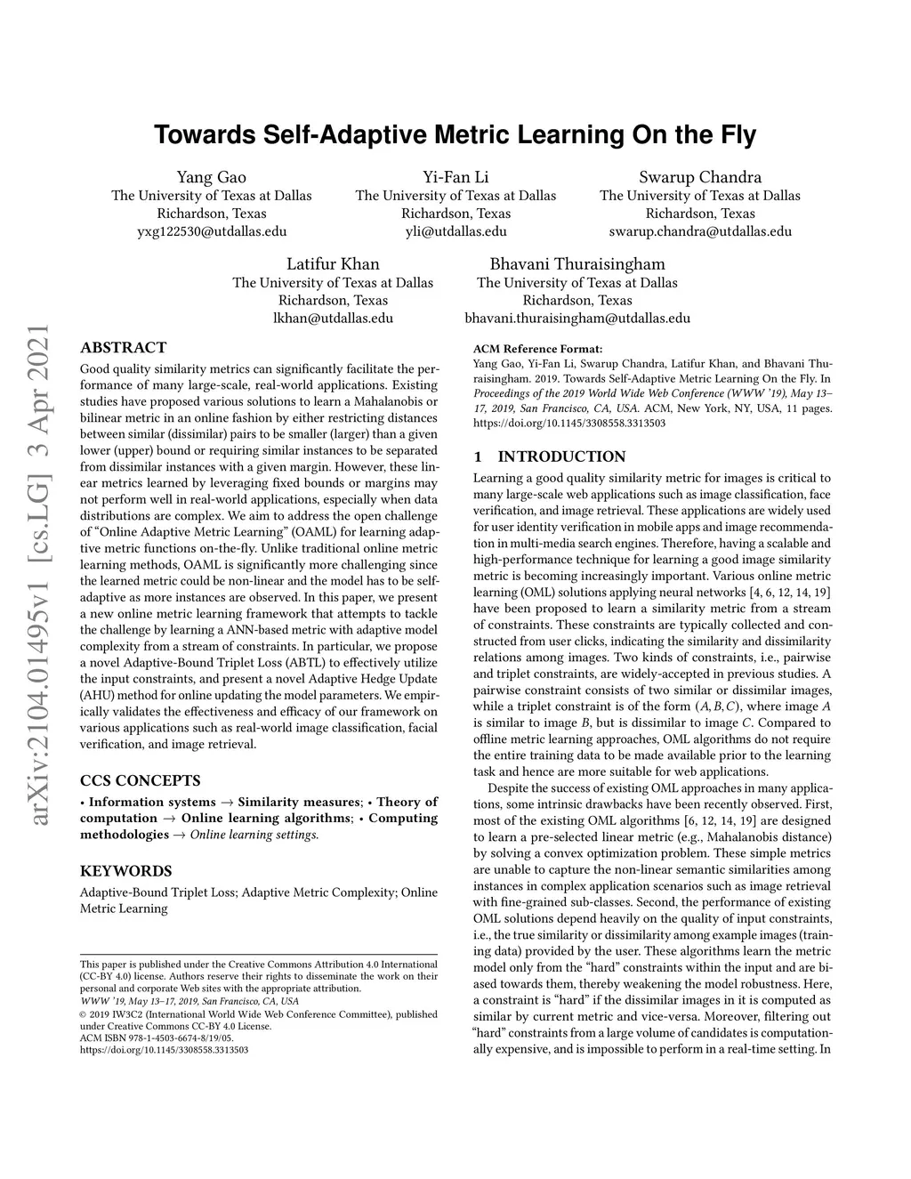 Good quality similarity metrics can significantly facilitate the performance of many large-scale, real-world applications. Existing studies have proposed various solutions to learn a Mahalanobis or bilinear metric in an online fashion by either restricting distances between similar (dissimilar) pairs to be smaller (larger) than a given lower (upper) bound or requiring similar instances to be separated from dissimilar instances with a given margin. However, these linear metrics learned by leveraging fixed bounds or margins may not perform well in real-world applications, especially when data distributions are complex. We aim to address the open challenge of "Online Adaptive Metric Learning" (OAML) for learning adaptive metric functions on the fly. Unlike traditional online metric learning methods, OAML is significantly more challenging since the learned metric could be non-linear and the model has to be self-adaptive as more instances are observed. In this paper, we present a new online metric learning framework that attempts to tackle the challenge by learning an ANN-based metric with adaptive model complexity from a stream of constraints. In particular, we propose a novel Adaptive-Bound Triplet Loss (ABTL) to effectively utilize the input constraints and present a novel Adaptive Hedge Update (AHU) method for online updating the model parameters. We empirically validate the effectiveness and efficacy of our framework on various applications such as real-world image classification, facial verification, and image retrieval.
