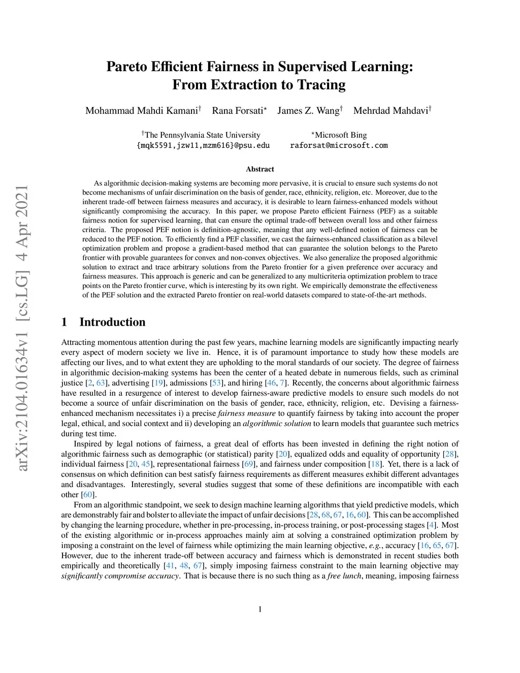 As algorithmic decision-making systems are becoming more pervasive, it is crucial to ensure such systems do not become mechanisms of unfair discrimination on the basis of gender, race, ethnicity, religion, etc. Moreover, due to the inherent trade-off between fairness measures and accuracy, it is desirable to learn fairness-enhanced models without significantly compromising the accuracy. In this paper, we propose Pareto efficient Fairness (PEF) as a suitable fairness notion for supervised learning, that can ensure the optimal trade-off between overall loss and other fairness criteria. The proposed PEF notion is definition-agnostic, meaning that any well-defined notion of fairness can be reduced to the PEF notion. To efficiently find a PEF classifier, we cast the fairness-enhanced classification as a bilevel optimization problem and propose a gradient-based method that can guarantee the solution belongs to the Pareto frontier with provable guarantees for convex and non-convex objectives. We also generalize the proposed algorithmic solution to extract and trace arbitrary solutions from the Pareto frontier for a given preference over accuracy and fairness measures. This approach is generic and can be generalized to any multicriteria optimization problem to trace points on the Pareto frontier curve, which is interesting by its own right. We empirically demonstrate the effectiveness of the PEF solution and the extracted Pareto frontier on real-world datasets compared to state-of-the-art methods.