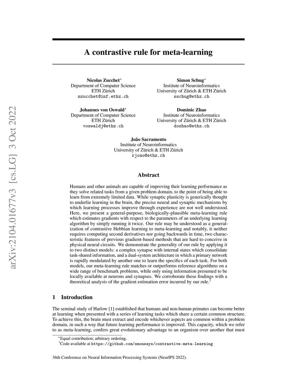 Humans and other animals are capable of improving their learning performance as they solve related tasks from a given problem domain, to the point of being able to learn from extremely limited data. While synaptic plasticity is generically thought to underlie learning in the brain, the precise neural and synaptic mechanisms by which learning processes improve through experience are not well understood. Here, we present a general-purpose, biologically-plausible meta-learning rule which estimates gradients with respect to the parameters of an underlying learning algorithm by simply running it twice. Our rule may be understood as a generalization of contrastive Hebbian learning to meta-learning and notably, it neither requires computing second derivatives nor going backwards in time, two characteristic features of previous gradient-based methods that are hard to conceive in physical neural circuits. We demonstrate the generality of our rule by applying it to two distinct models: a complex synapse with internal states which consolidate task-shared information, and a dual-system architecture in which a primary network is rapidly modulated by another one to learn the specifics of each task. For both models, our meta-learning rule matches or outperforms reference algorithms on a wide range of benchmark problems, while only using information presumed to be locally available at neurons and synapses. We corroborate these findings with a theoretical analysis of the gradient estimation error incurred by our rule.
