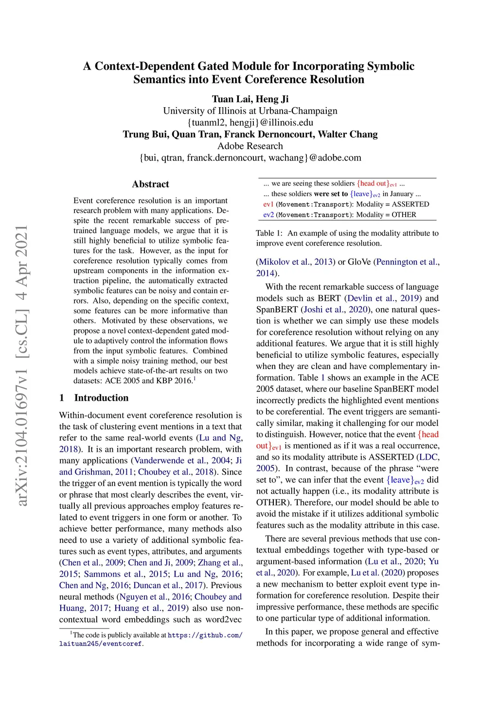 Event coreference resolution is an important research problem with many applications. Despite the recent remarkable success of pretrained language models, we argue that it is still highly beneficial to utilize symbolic features for the task. However, as the input for coreference resolution typically comes from upstream components in the information extraction pipeline, the automatically extracted symbolic features can be noisy and contain errors. Also, depending on the specific context, some features can be more informative than others. Motivated by these observations, we propose a novel context-dependent gated module to adaptively control the information flows from the input symbolic features. Combined with a simple noisy training method, our best models achieve state-of-the-art results on two datasets: ACE 2005 and KBP 2016.