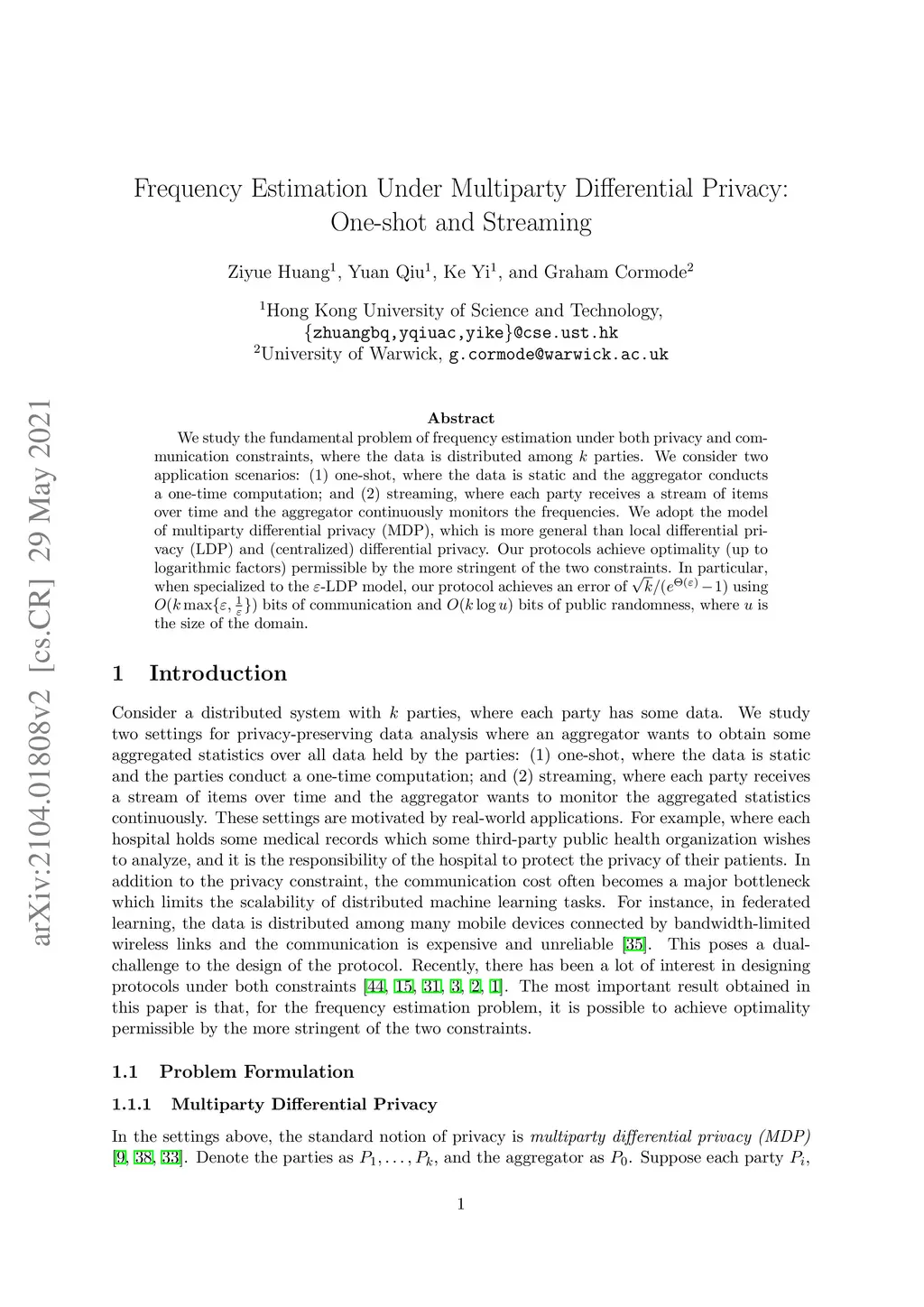 We study the fundamental problem of frequency estimation under both privacy and communication constraints, where the data is distributed among parties. We consider two application scenarios: (1) one-shot, where the data is static and the aggregator conducts a one-time computation; and (2) streaming, where each party receives a stream of items over time and the aggregator continuously monitors the frequencies. We adopt the model of multiparty differential privacy (MDP), which is more general than local differential privacy (LDP) and (centralized) differential privacy. Our protocols achieve optimality (up to logarithmic factors) permissible by the more stringent of the two constraints. In particular, when specialized to the -LDP model, our protocol achieves an error of using bits of communication and bits of public randomness, where is the size of the domain.