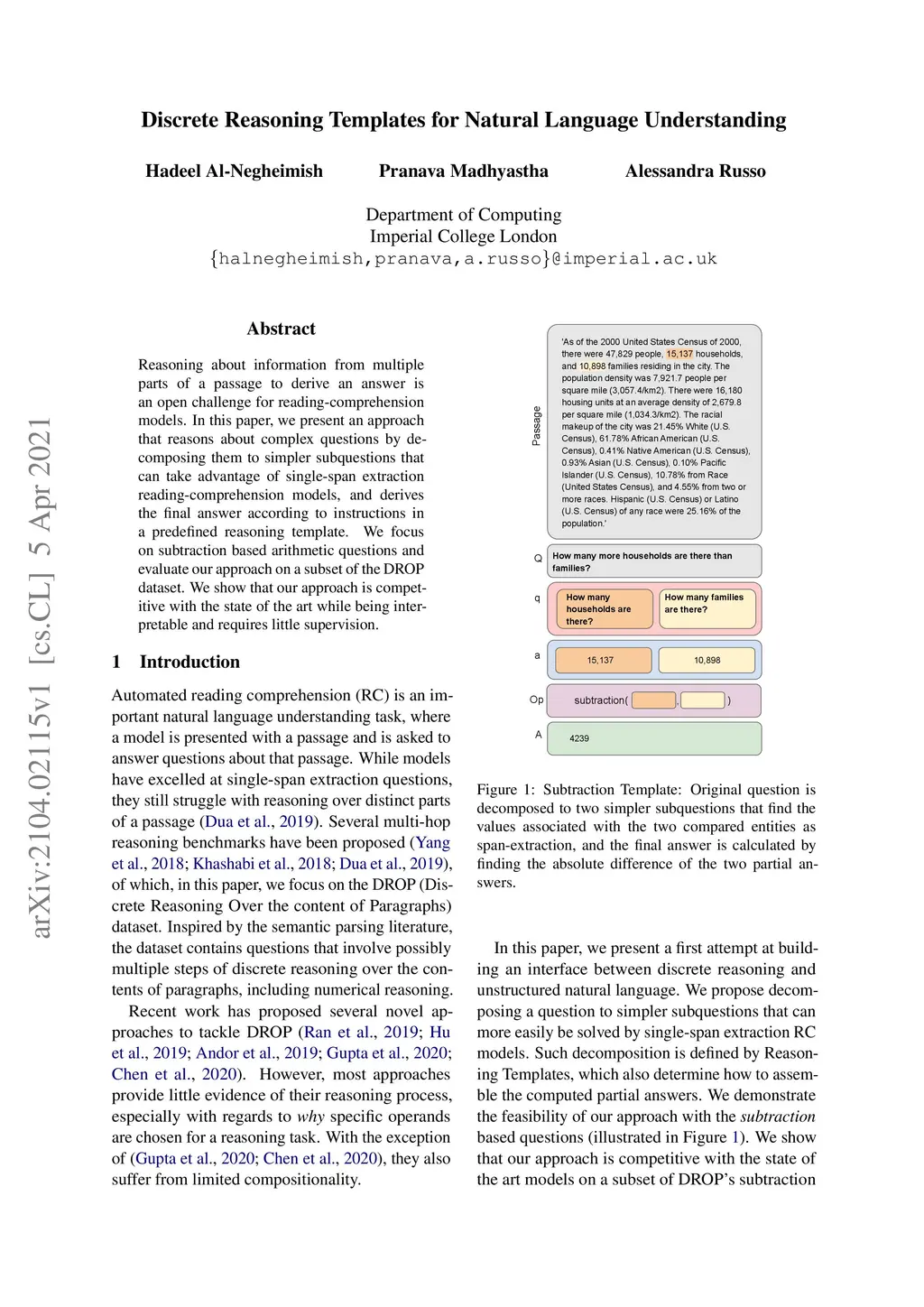 Reasoning about information from multiple parts of a passage to derive an answer is an open challenge for reading-comprehension models. In this paper, we present an approach that reasons about complex questions by decomposing them to simpler subquestions that can take advantage of single-span extraction reading-comprehension models, and derives the final answer according to instructions in a predefined reasoning template. We focus on subtraction-based arithmetic questions and evaluate our approach on a subset of the DROP dataset. We show that our approach is competitive with the state-of-the-art while being interpretable and requires little supervision
