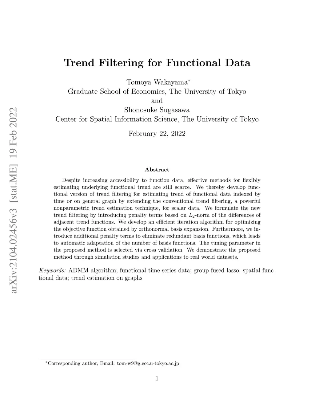 Despite increasing accessibility to function data, effective methods for flexibly estimating underlying functional trend are still scarce. We thereby develop functional version of trend filtering for estimating trend of functional data indexed by time or on general graph by extending the conventional trend filtering, a powerful nonparametric trend estimation technique, for scalar data. We formulate the new trend filtering by introducing penalty terms based on -norm of the differences of adjacent trend functions. We develop an efficient iteration algorithm for optimizing the objective function obtained by orthonormal basis expansion. Furthermore, we introduce additional penalty terms to eliminate redundant basis functions, which leads to automatic adaptation of the number of basis functions. The tuning parameter in the proposed method is selected via cross validation. We demonstrate the proposed method through simulation studies and applications to real world datasets.