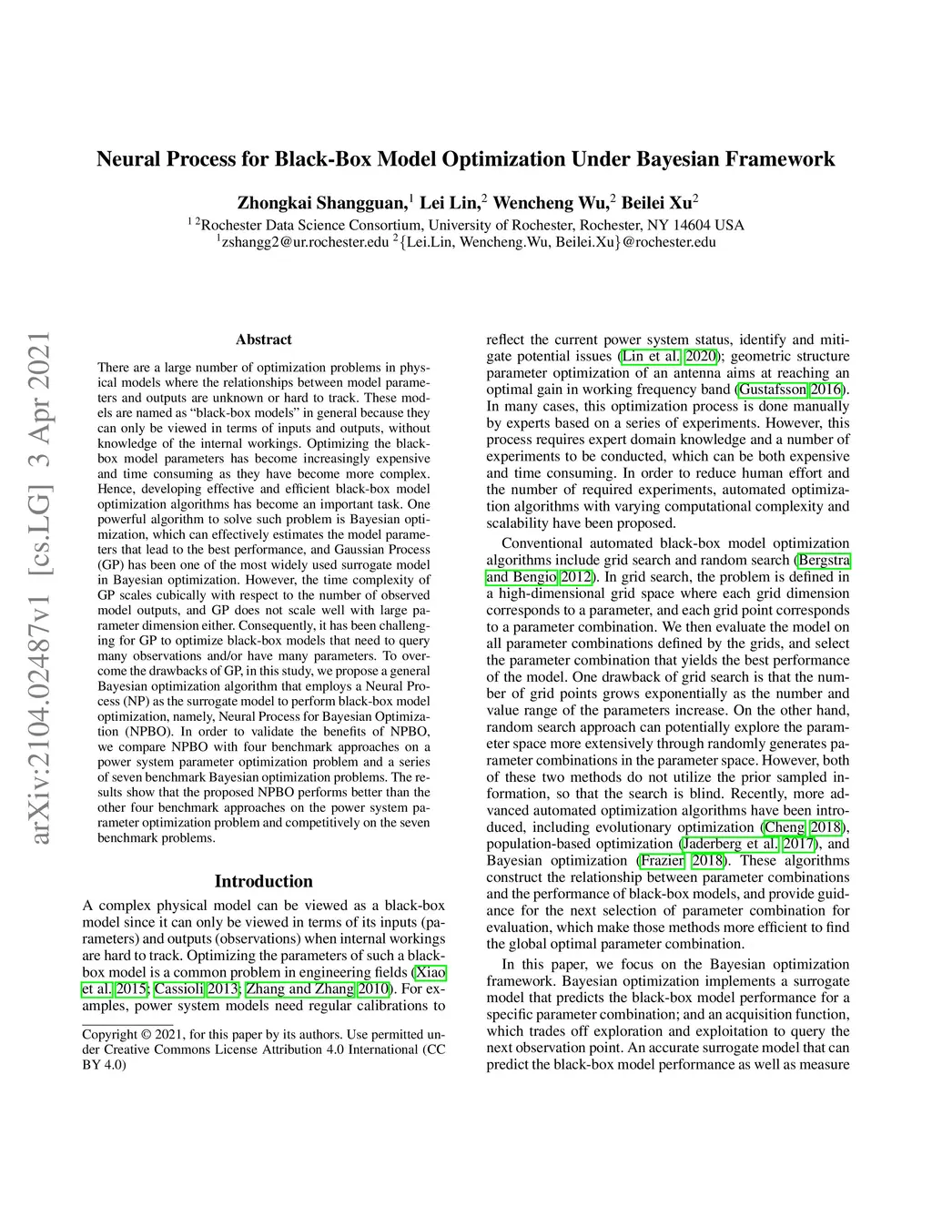 There are a large number of optimization problems in physical models where the relationships between model parameters and outputs are unknown or hard to track. These models are named as black-box models in general because they can only be viewed in terms of inputs and outputs, without knowledge of the internal workings. Optimizing the black-box model parameters has become increasingly expensive and time consuming as they have become more complex. Hence, developing effective and efficient black-box model optimization algorithms has become an important task. One powerful algorithm to solve such problem is Bayesian optimization, which can effectively estimates the model parameters that lead to the best performance, and Gaussian Process (GP) has been one of the most widely used surrogate model in Bayesian optimization. However, the time complexity of GP scales cubically with respect to the number of observed model outputs, and GP does not scale well with large parameter dimension either. Consequently, it has been challenging for GP to optimize black-box models that need to query many observations and/or have many parameters. To overcome the drawbacks of GP, in this study, we propose a general Bayesian optimization algorithm that employs a Neural Process (NP) as the surrogate model to perform black-box model optimization, namely, Neural Process for Bayesian Optimization (NPBO). In order to validate the benefits of NPBO, we compare NPBO with four benchmark approaches on a power system parameter optimization problem and a series of seven benchmark Bayesian optimization problems. The results show that the proposed NPBO performs better than the other four benchmark approaches on the power system parameter optimization problem and competitively on the seven benchmark problems.