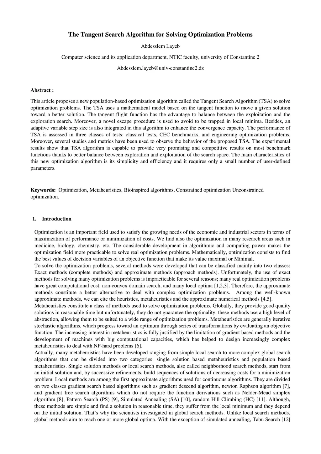 The Tangent Search Algorithm for Solving Optimization Problems