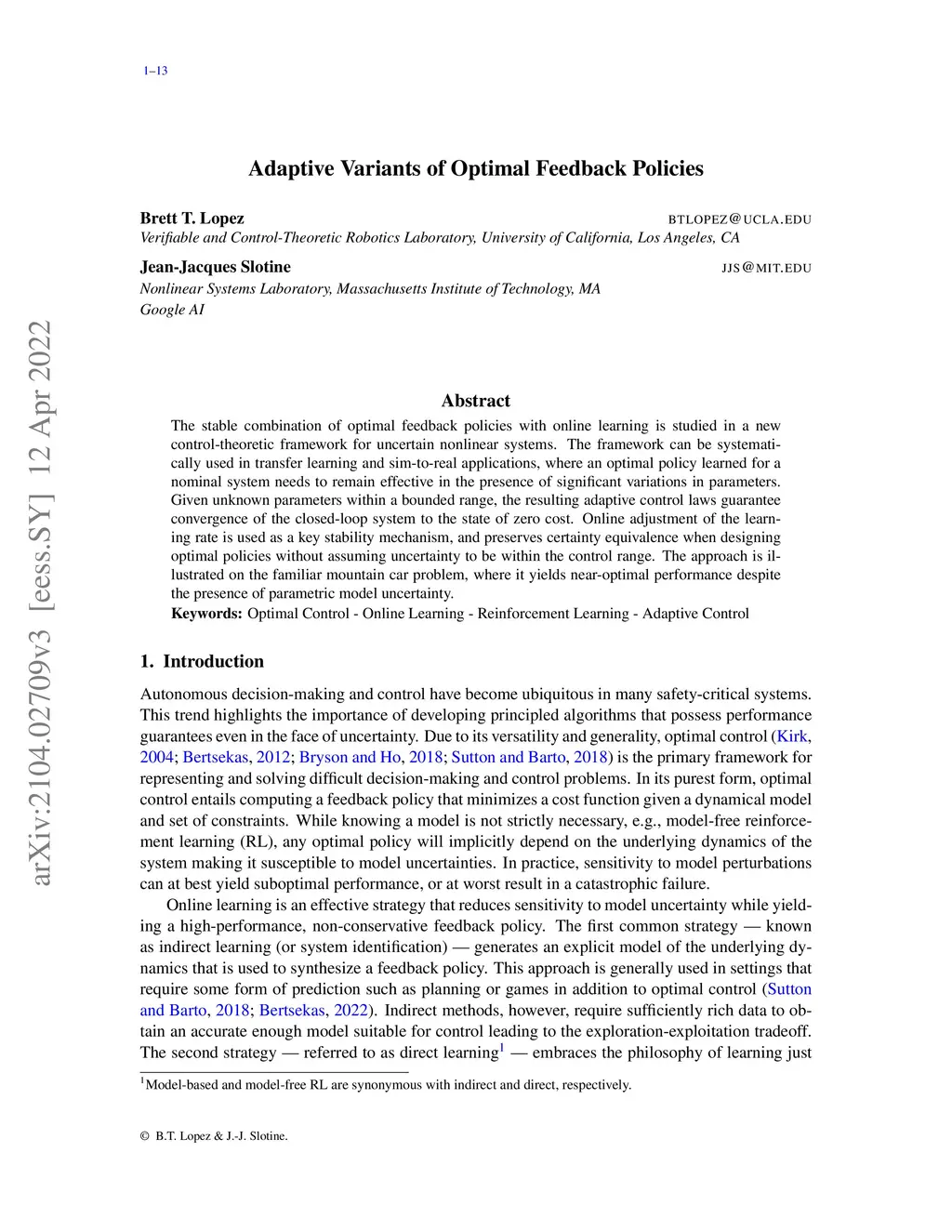 The stable combination of optimal feedback policies with online learning is studied in a new control-theoretic framework for uncertain nonlinear systems. The framework can be systematically used in transfer learning and sim-to-real applications, where an optimal policy learned for a nominal system needs to remain effective in the presence of significant variations in parameters. Given unknown parameters within a bounded range, the resulting adaptive control laws guarantee convergence of the closed-loop system to the state of zero cost. Online adjustment of the learning rate is used as a key stability mechanism, and preserves certainty equivalence when designing optimal policies without assuming uncertainty to be within the control range. The approach is illustrated on the familiar mountain car problem, where it yields near-optimal performance despite the presence of parametric model uncertainty.