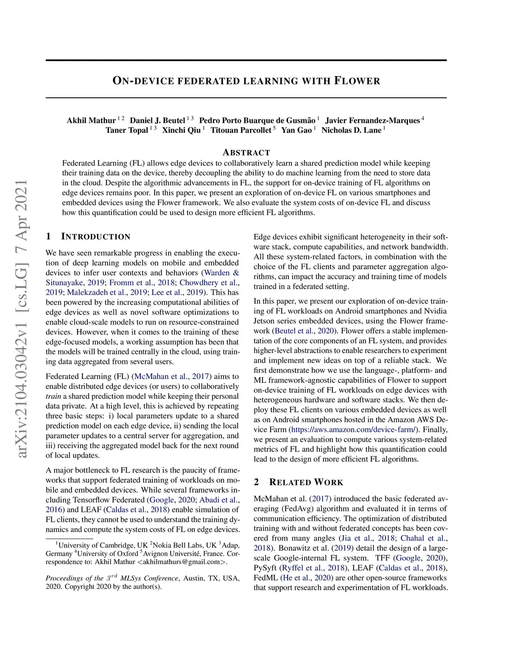 Federated Learning (FL) allows edge devices to collaboratively learn a shared prediction model while keeping their training data on the device, thereby decoupling the ability to do machine learning from the need to store data in the cloud. Despite the algorithmic advancements in FL, the support for on-device training of FL algorithms on edge devices remains poor. In this paper, we present an exploration of on-device FL on various smartphones and embedded devices using the Flower framework. We also evaluate the system costs of on-device FL and discuss how this quantification could be used to design more efficient FL algorithms.