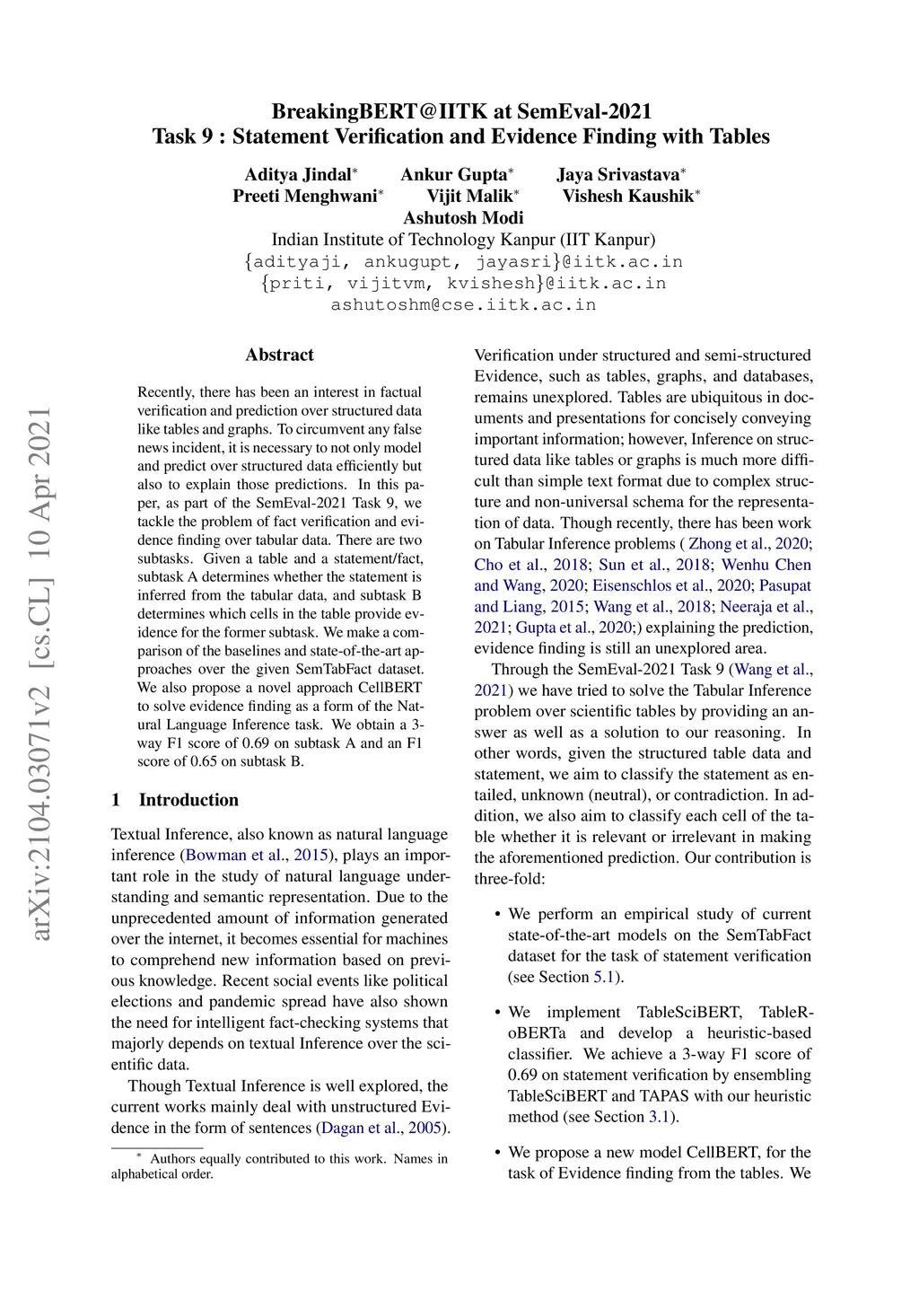 BreakingBERT@IITK at SemEval-2021 Task 9 : Statement Verification and