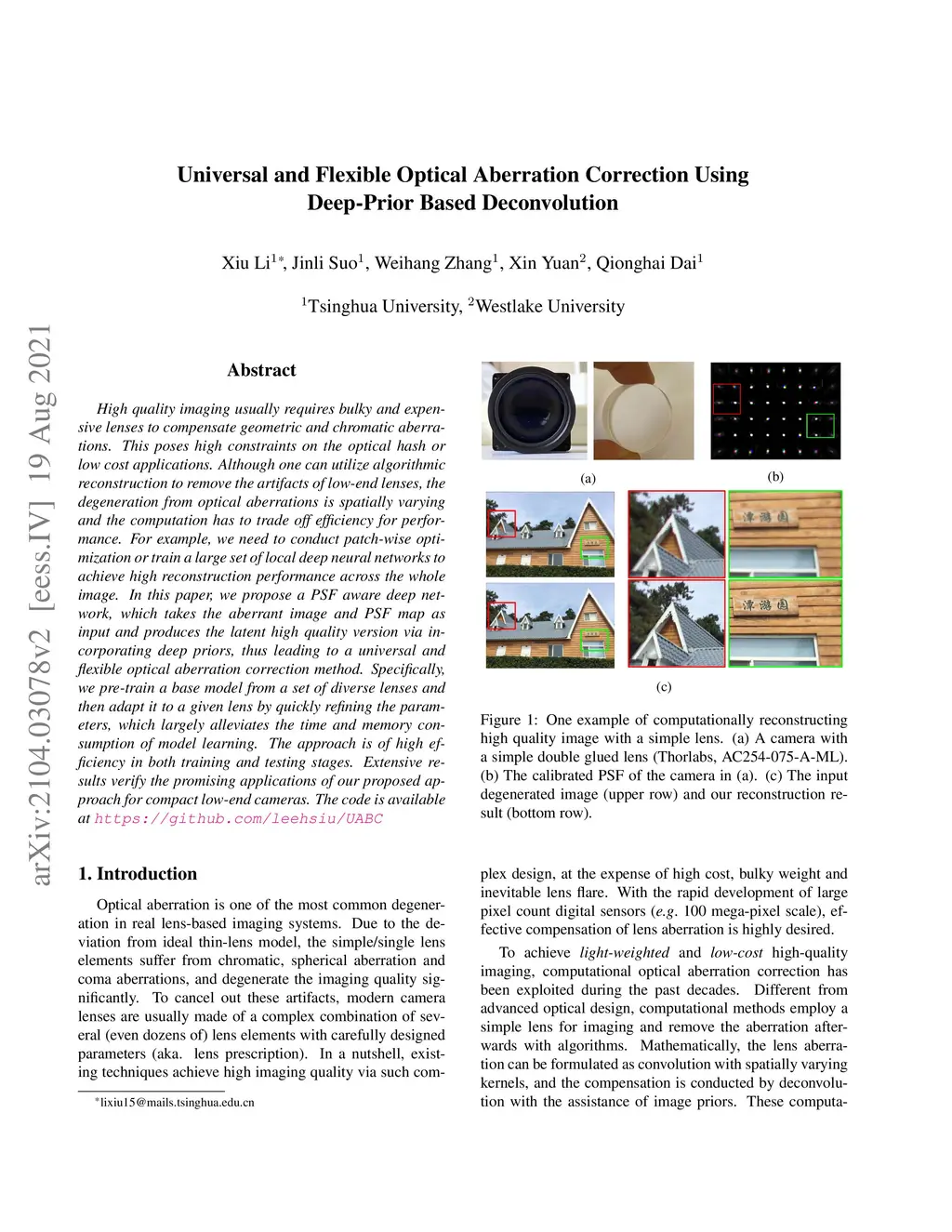 High quality imaging usually requires bulky and expensive lenses to compensate geometric and chromatic aberrations. This poses high constraints on the optical hash or low cost applications. Although one can utilize algorithmic reconstruction to remove the artifacts of low-end lenses, the degeneration from optical aberrations is spatially varying and the computation has to trade off efficiency for performance. For example, we need to conduct patch-wise optimization or train a large set of local deep neural networks to achieve high reconstruction performance across the whole image. In this paper, we propose a PSF aware plug-and-play deep network, which takes the aberrant image and PSF map as input and produces the latent high quality version via incorporating lens-specific deep priors, thus leading to a universal and flexible optical aberration correction method. Specifically, we pre-train a base model from a set of diverse lenses and then adapt it to a given lens by quickly refining the parameters, which largely alleviates the time and memory consumption of model learning. The approach is of high efficiency in both training and testing stages. Extensive results verify the promising applications of our proposed approach for compact low-end cameras.