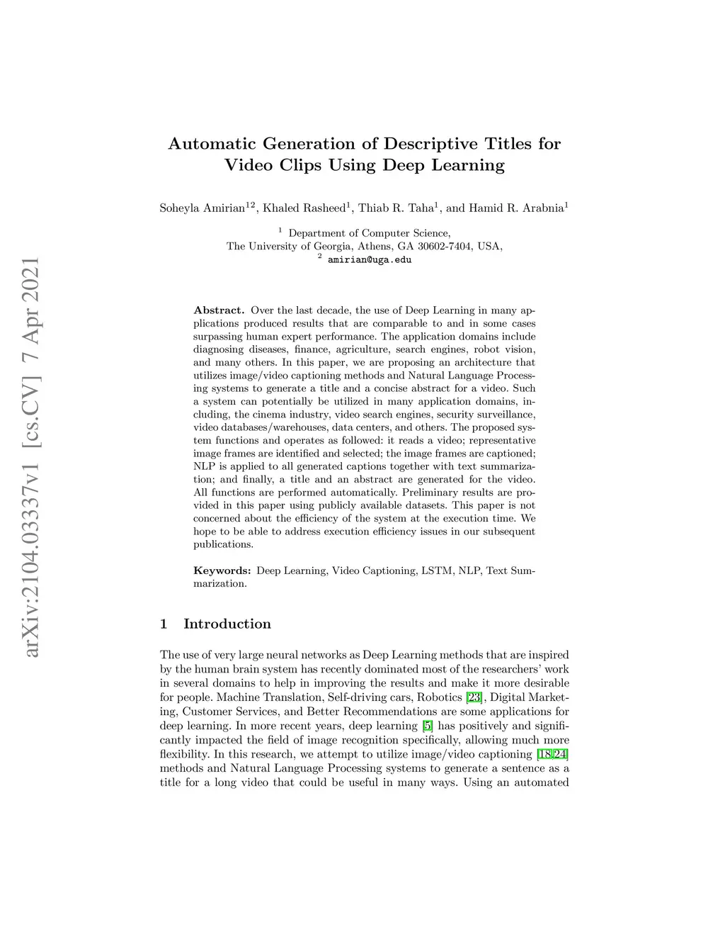 Over the last decade, the use of Deep Learning in many applications produced results that are comparable to and in some cases surpassing human expert performance. The application domains include diagnosing diseases, finance, agriculture, search engines, robot vision, and many others. In this paper, we are proposing an architecture that utilizes image/video captioning methods and Natural Language Processing systems to generate a title and a concise abstract for a video. Such a system can potentially be utilized in many application domains, including, the cinema industry, video search engines, security surveillance, video databases/warehouses, data centers, and others. The proposed system functions and operates as followed: it reads a video; representative image frames are identified and selected; the image frames are captioned; NLP is applied to all generated captions together with text summarization; and finally, a title and an abstract are generated for the video. All functions are performed automatically. Preliminary results are provided in this paper using publicly available datasets. This paper is not concerned about the efficiency of the system at the execution time. We hope to be able to address execution efficiency issues in our subsequent publications.