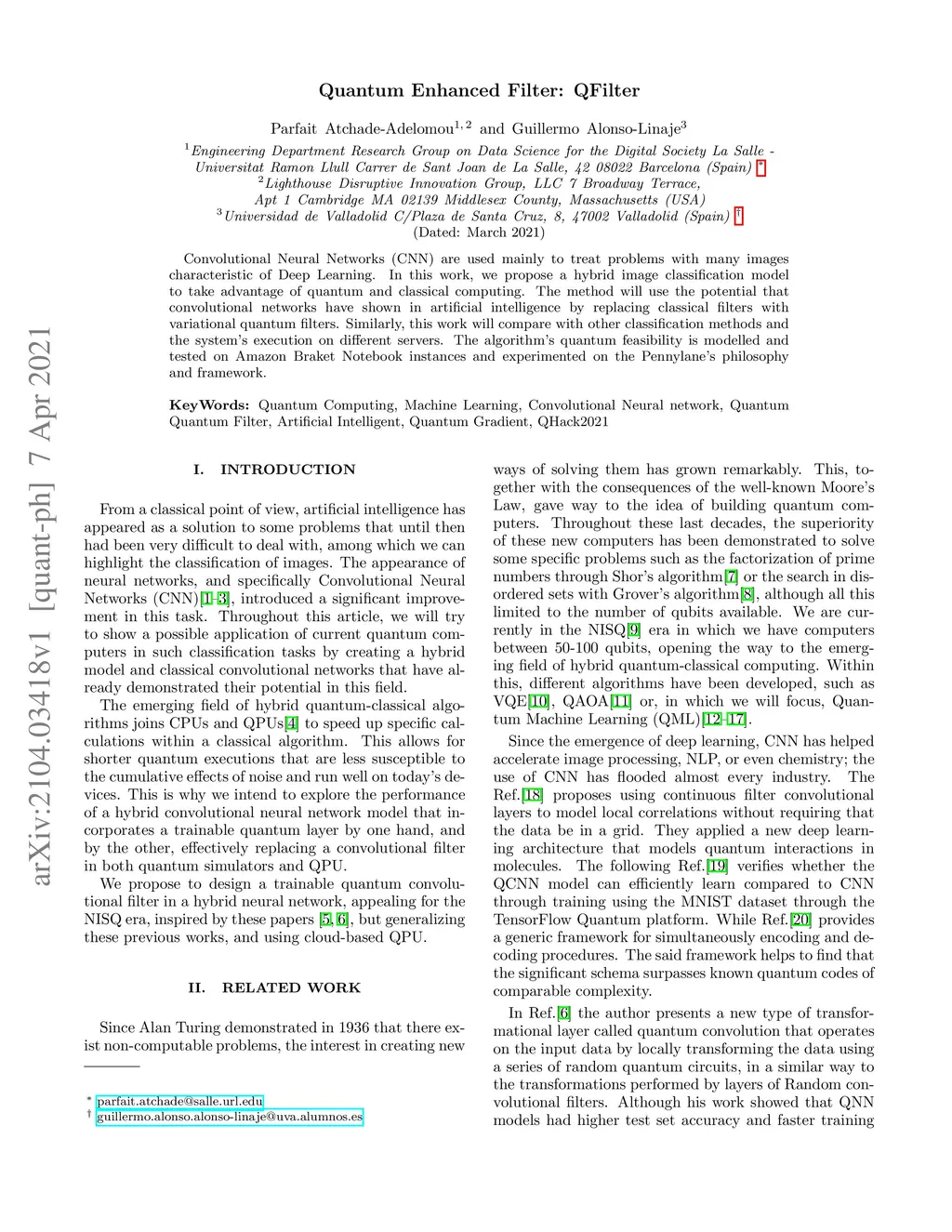Convolutional Neural Networks (CNN) are used mainly to treat problems with many images characteristic of Deep Learning. In this work, we propose a hybrid image classification model to take advantage of quantum and classical computing. The method will use the potential that convolutional networks have shown in artificial intelligence by replacing classical filters with variational quantum filters. Similarly, this work will compare with other classification methods and the system's execution on different servers. The algorithm's quantum feasibility is modelled and tested on Amazon Braket Notebook instances and experimented on the Pennylane's philosophy and framework.