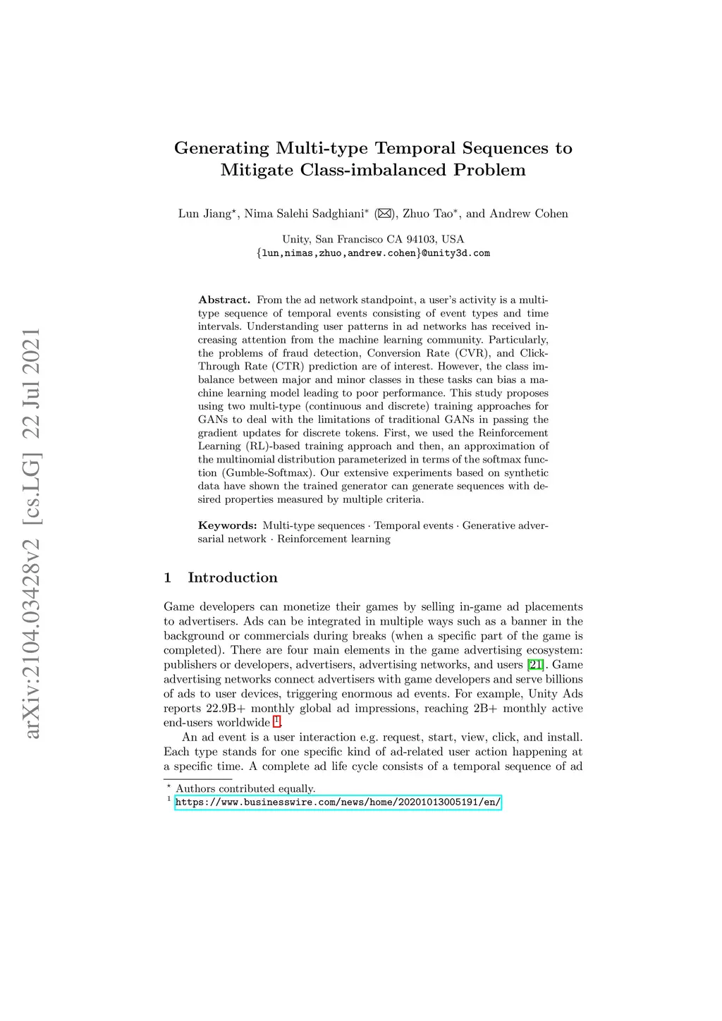 From the ad network standpoint, a user's activity is a multi-type sequence of temporal events consisting of event types and time intervals. Understanding user patterns in ad networks has received increasing attention from the machine learning community. Particularly, the problems of fraud detection, Conversion Rate (CVR), and Click-Through Rate (CTR) prediction are of interest. However, the class imbalance between major and minor classes in these tasks can bias a machine learning model leading to poor performance. This study proposes using two multi-type (continuous and discrete) training approaches for GANs to deal with the limitations of traditional GANs in passing the gradient updates for discrete tokens. First, we used the Reinforcement Learning (RL)-based training approach and then, an approximation of the multinomial distribution parameterized in terms of the softmax function (Gumble-Softmax). Our extensive experiments based on synthetic data have shown the trained generator can generate sequences with desired properties measured by multiple criteria.