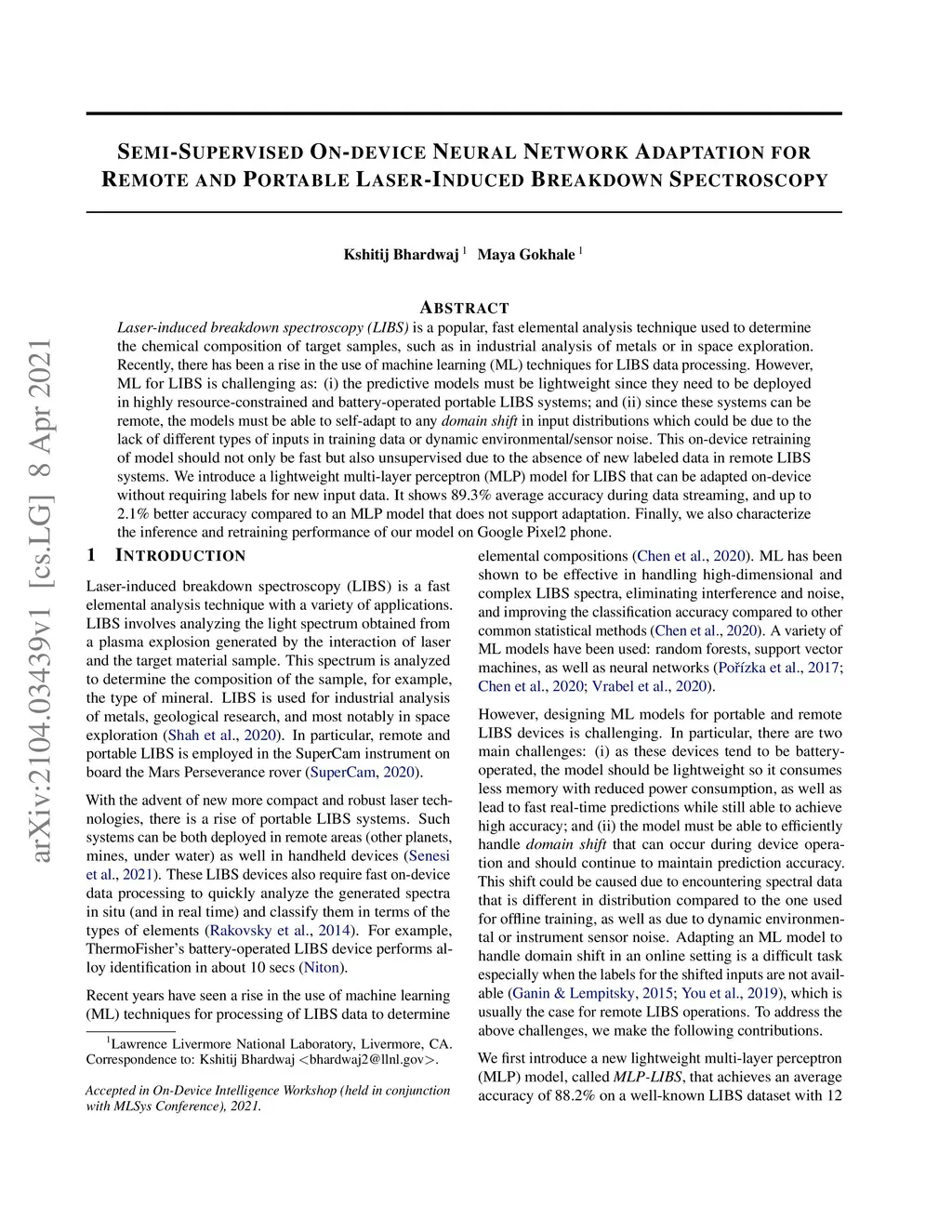 Laser-induced breakdown spectroscopy (LIBS) is a popular, fast elemental analysis technique used to determine the chemical composition of target samples, such as in industrial analysis of metals or in space exploration. Recently, there has been a rise in the use of machine learning (ML) techniques for LIBS data processing. However, ML for LIBS is challenging as: (i) the predictive models must be lightweight since they need to be deployed in highly resource-constrained and battery-operated portable LIBS systems; and (ii) since these systems can be remote, the models must be able to self-adapt to any domain shift in input distributions which could be due to the lack of different types of inputs in training data or dynamic environmental/sensor noise. This on-device retraining of model should not only be fast but also unsupervised due to the absence of new labeled data in remote LIBS systems. We introduce a lightweight multi-layer perceptron (MLP) model for LIBS that can be adapted on-device without requiring labels for new input data. It shows 89.3% average accuracy during data streaming, and up to 2.1% better accuracy compared to an MLP model that does not support adaptation. Finally, we also characterize the inference and retraining performance of our model on Google Pixel2 phone.