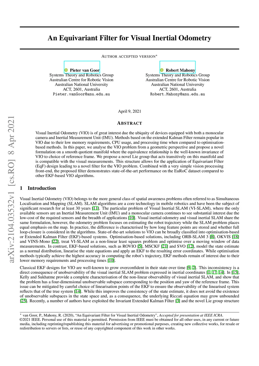 Visual Inertial Odometry (VIO) is of great interest due the ubiquity of devices equipped with both a monocular camera and Inertial Measurement Unit (IMU). Methods based on the extended Kalman Filter remain popular in VIO due to their low memory requirements, CPU usage, and processing time when compared to optimisation-based methods. In this paper, we analyse the VIO problem from a geometric perspective and propose a novel formulation on a smooth quotient manifold where the equivalence relationship is the well-known invariance of VIO to choice of reference frame. We propose a novel Lie group that acts transitively on this manifold and is compatible with the visual measurements. This structure allows for the application of Equivariant Filter (EqF) design leading to a novel filter for the VIO problem. Combined with a very simple vision processing front-end, the proposed filter demonstrates state-of-the-art performance on the EuRoC dataset compared to other EKF-based VIO algorithms.