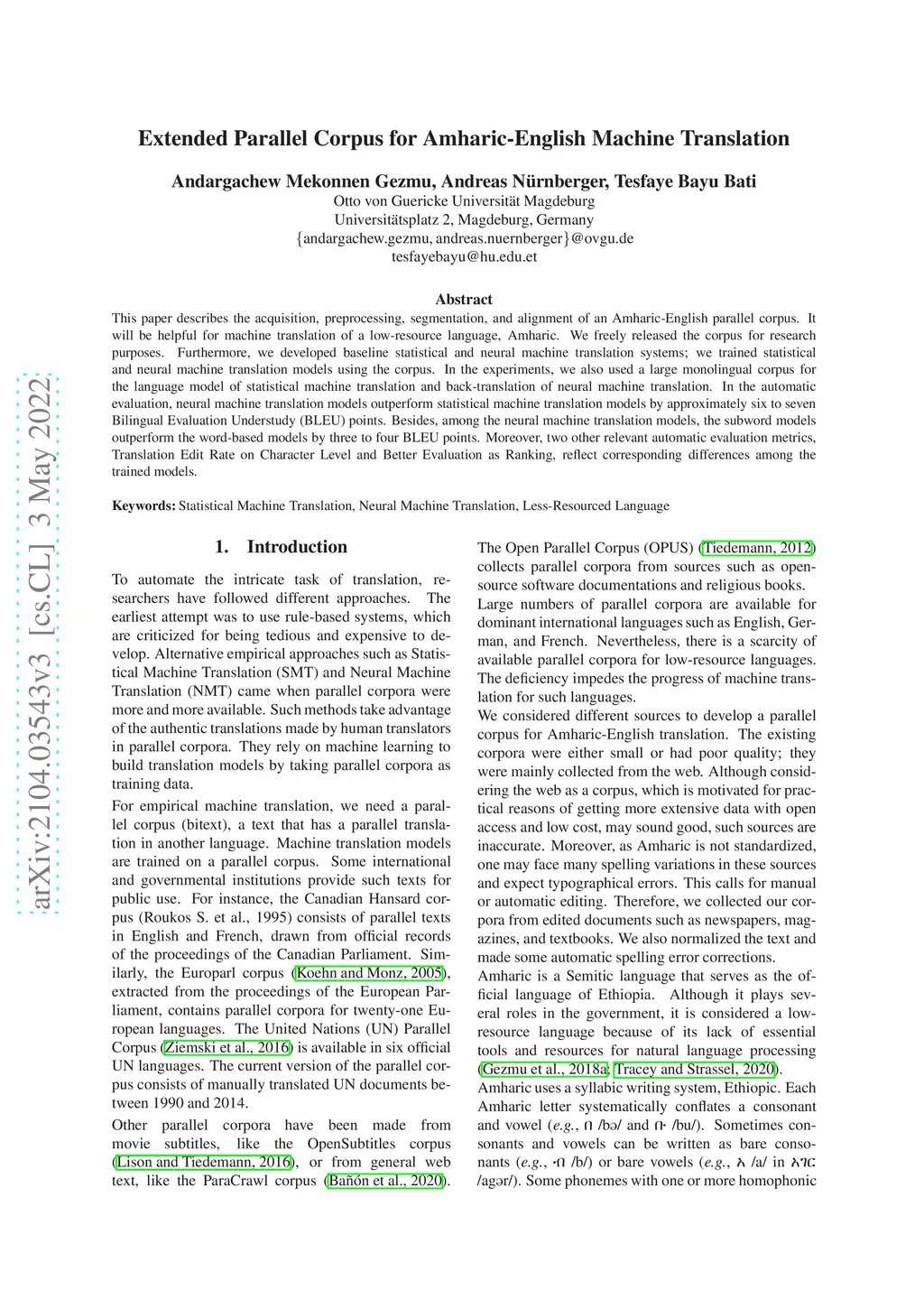 Extended Parallel Corpus for Amharic-English Machine Translation