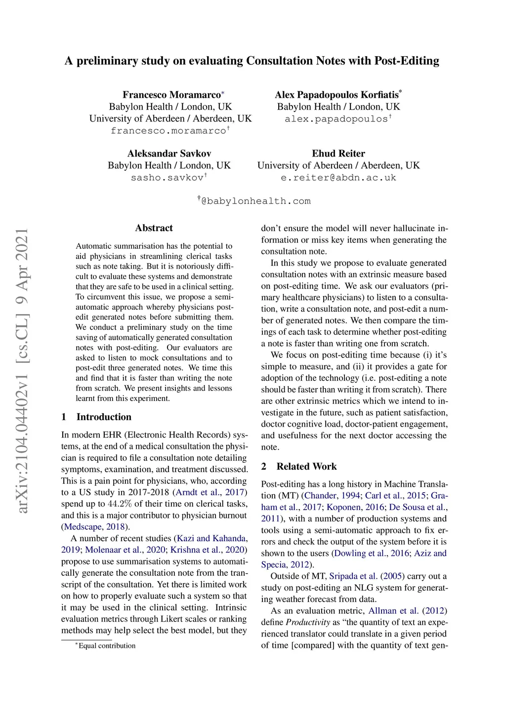 Automatic summarisation has the potential to aid physicians in streamlining clerical tasks such as note taking. But it is notoriously difficult to evaluate these systems and demonstrate that they are safe to be used in a clinical setting. To circumvent this issue, we propose a semi-automatic approach whereby physicians post-edit generated notes before submitting them. We conduct a preliminary study on the time saving of automatically generated consultation notes with post-editing. Our evaluators are asked to listen to mock consultations and to post-edit three generated notes. We time this and find that it is faster than writing the note from scratch. We present insights and lessons learnt from this experiment.