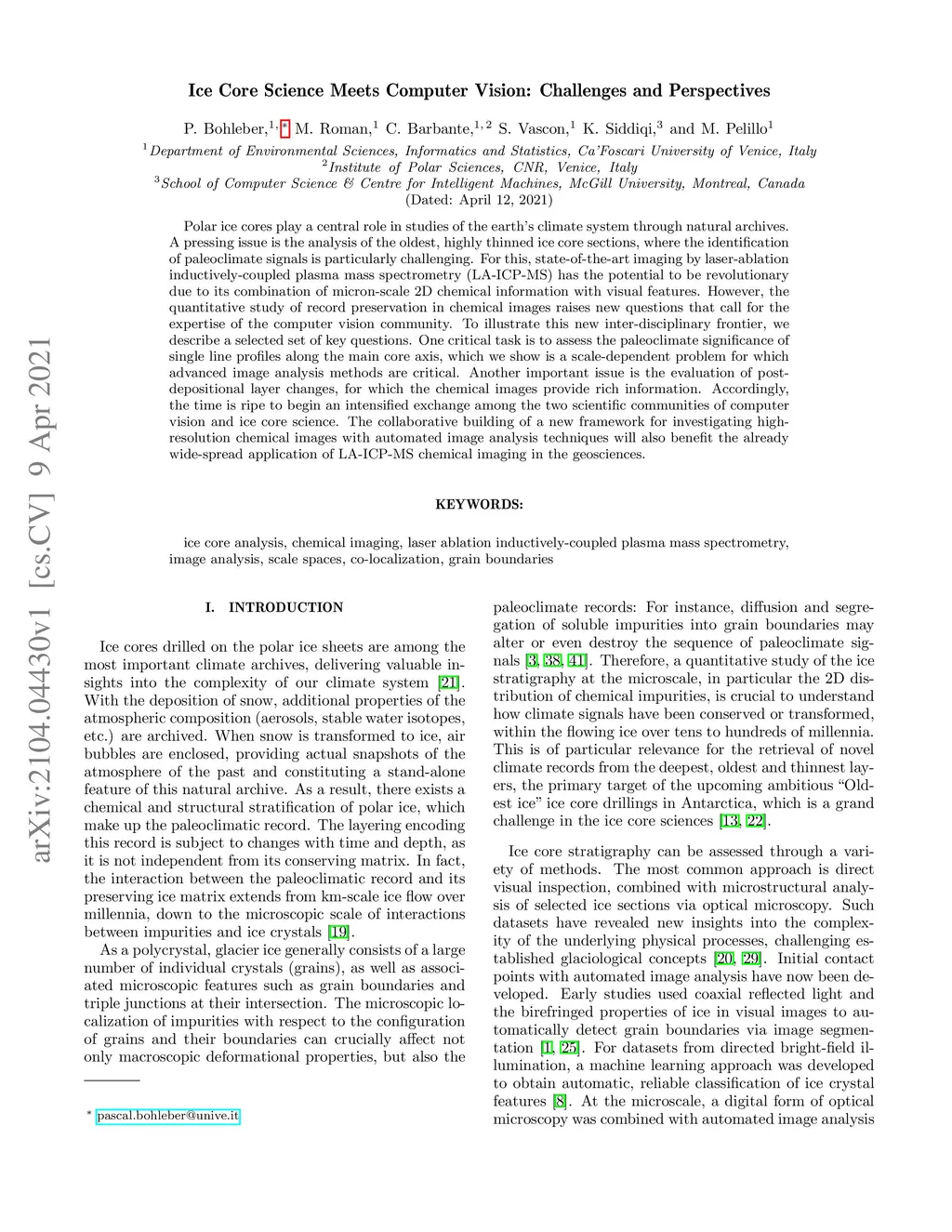 Polar ice cores play a central role in studies of the earth's climate system through natural archives. A pressing issue is the analysis of the oldest, highly thinned ice core sections, where the identification of paleoclimate signals is particularly challenging. For this, state-of-the-art imaging by laser-ablation inductively-coupled plasma mass spectrometry (LA-ICP-MS) has the potential to be revolutionary due to its combination of micron-scale 2D chemical information with visual features. However, the quantitative study of record preservation in chemical images raises new questions that call for the expertise of the computer vision community. To illustrate this new inter-disciplinary frontier, we describe a selected set of key questions. One critical task is to assess the paleoclimate significance of single line profiles along the main core axis, which we show is a scale-dependent problem for which advanced image analysis methods are critical. Another important issue is the evaluation of post-depositional layer changes, for which the chemical images provide rich information. Accordingly, the time is ripe to begin an intensified exchange among the two scientific communities of computer vision and ice core science. The collaborative building of a new framework for investigating high-resolution chemical images with automated image analysis techniques will also benefit the already wide-spread application of LA-ICP-MS chemical imaging in the geosciences.