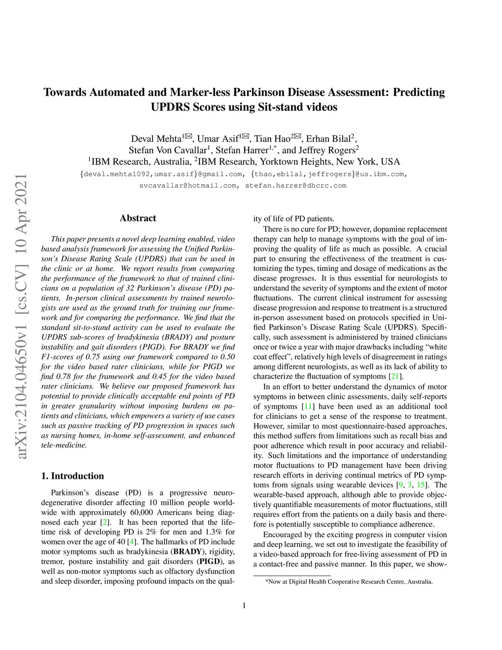 Towards Automated and Marker-less Parkinson Disease Assessment: