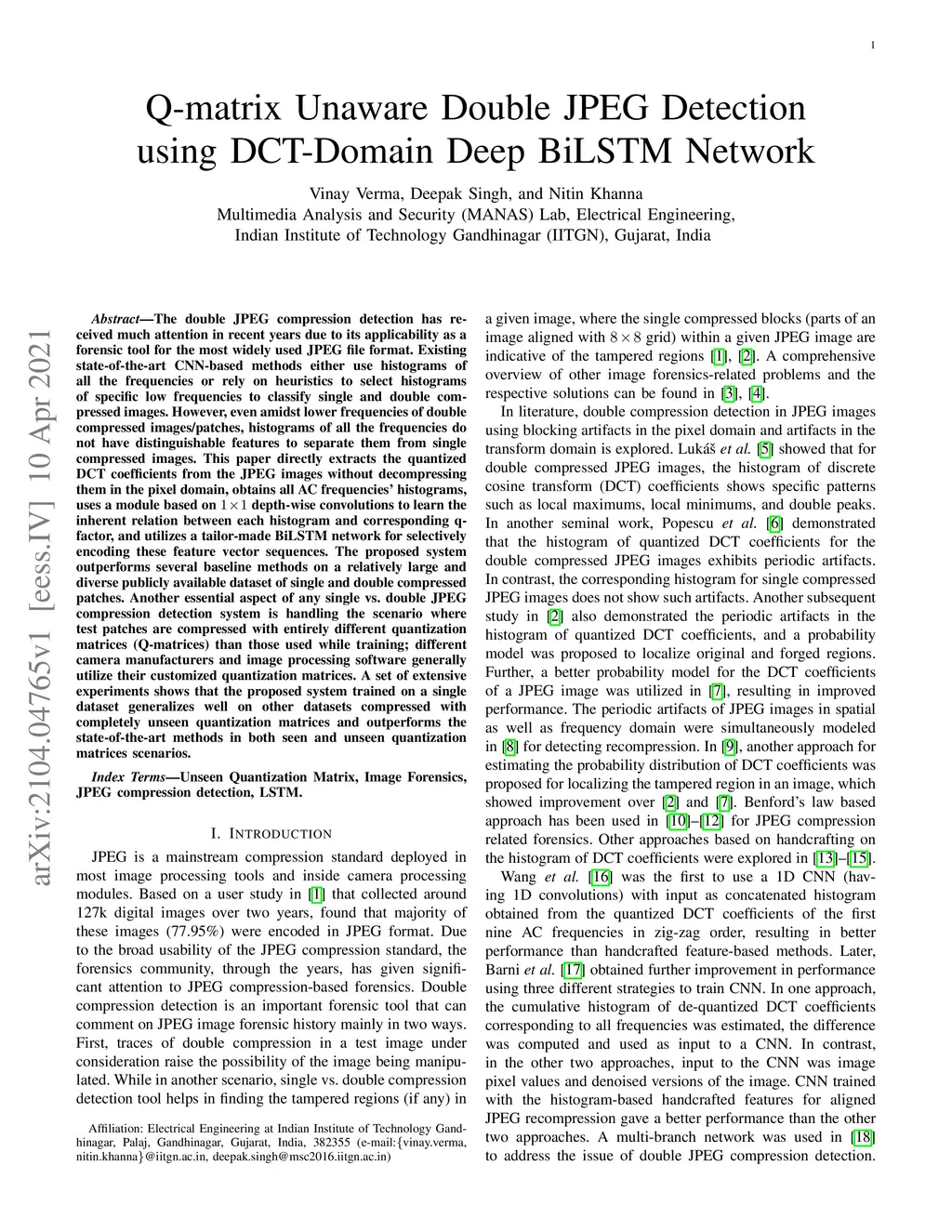 The double JPEG compression detection has received much attention in recent years due to its applicability as a forensic tool for the most widely used JPEG file format. Existing state-of-the-art CNN-based methods either use histograms of all the frequencies or rely on heuristics to select histograms of specific low frequencies to classify single and double compressed images. However, even amidst lower frequencies of double compressed images/patches, histograms of all the frequencies do not have distinguishable features to separate them from single compressed images. This paper directly extracts the quantized DCT coefficients from the JPEG images without decompressing them in the pixel domain, obtains all AC frequencies' histograms, uses a module based on depth-wise convolutions to learn the inherent relation between each histogram and corresponding q-factor, and utilizes a tailor-made BiLSTM network for selectively encoding these feature vector sequences. The proposed system outperforms several baseline methods on a relatively large and diverse publicly available dataset of single and double compressed patches. Another essential aspect of any single vs. double JPEG compression detection system is handling the scenario where test patches are compressed with entirely different quantization matrices (Q-matrices) than those used while training; different camera manufacturers and image processing software generally utilize their customized quantization matrices. A set of extensive experiments shows that the proposed system trained on a single dataset generalizes well on other datasets compressed with completely unseen quantization matrices and outperforms the state-of-the-art methods in both seen and unseen quantization matrices scenarios.