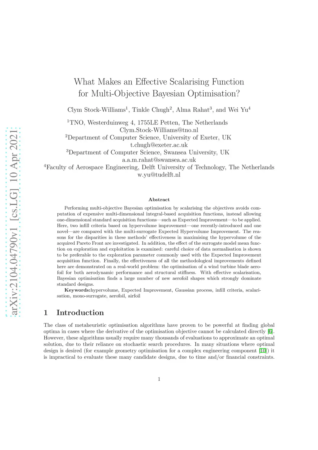 Performing multi-objective Bayesian optimisation by scalarising the objectives avoids the computation of expensive multi-dimensional integral-based acquisition functions, instead of allowing one-dimensional standard acquisition functions\textemdash such as Expected Improvement\textemdash to be applied. Here, two infill criteria based on hypervolume improvement\textemdash one recently introduced and one novel\textemdash are compared with the multi-surrogate Expected Hypervolume Improvement. The reasons for the disparities in these methods' effectiveness in maximising the hypervolume of the acquired Pareto Front are investigated. In addition, the effect of the surrogate model mean function on exploration and exploitation is examined: careful choice of data normalisation is shown to be preferable to the exploration parameter commonly used with the Expected Improvement acquisition function. Finally, the effectiveness of all the methodological improvements defined here is demonstrated on a real-world problem: the optimisation of a wind turbine blade aerofoil for both aerodynamic performance and structural stiffness. With effective scalarisation, Bayesian optimisation finds a large number of new aerofoil shapes that strongly dominate standard designs.