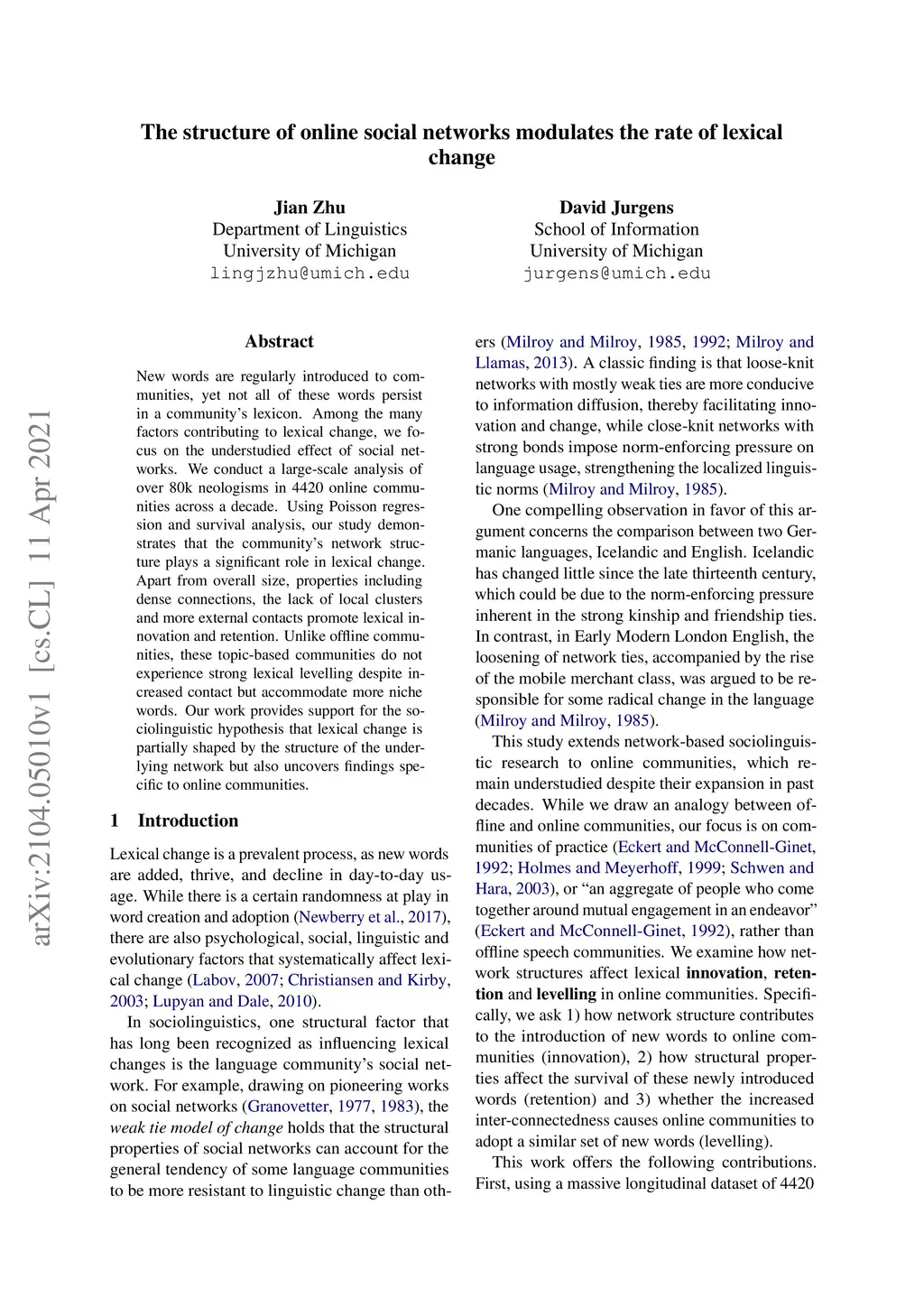 New words are regularly introduced to communities, yet not all of these words persist in a community's lexicon. Among the many factors contributing to lexical change, we focus on the understudied effect of social networks. We conduct a large-scale analysis of over 80k neologisms in 4420 online communities across a decade. Using Poisson regression and survival analysis, our study demonstrates that the community's network structure plays a significant role in lexical change. Apart from overall size, properties including dense connections, the lack of local clusters and more external contacts promote lexical innovation and retention. Unlike offline communities, these topic-based communities do not experience strong lexical levelling despite increased contact but accommodate more niche words. Our work provides support for the sociolinguistic hypothesis that lexical change is partially shaped by the structure of the underlying network but also uncovers findings specific to online communities.