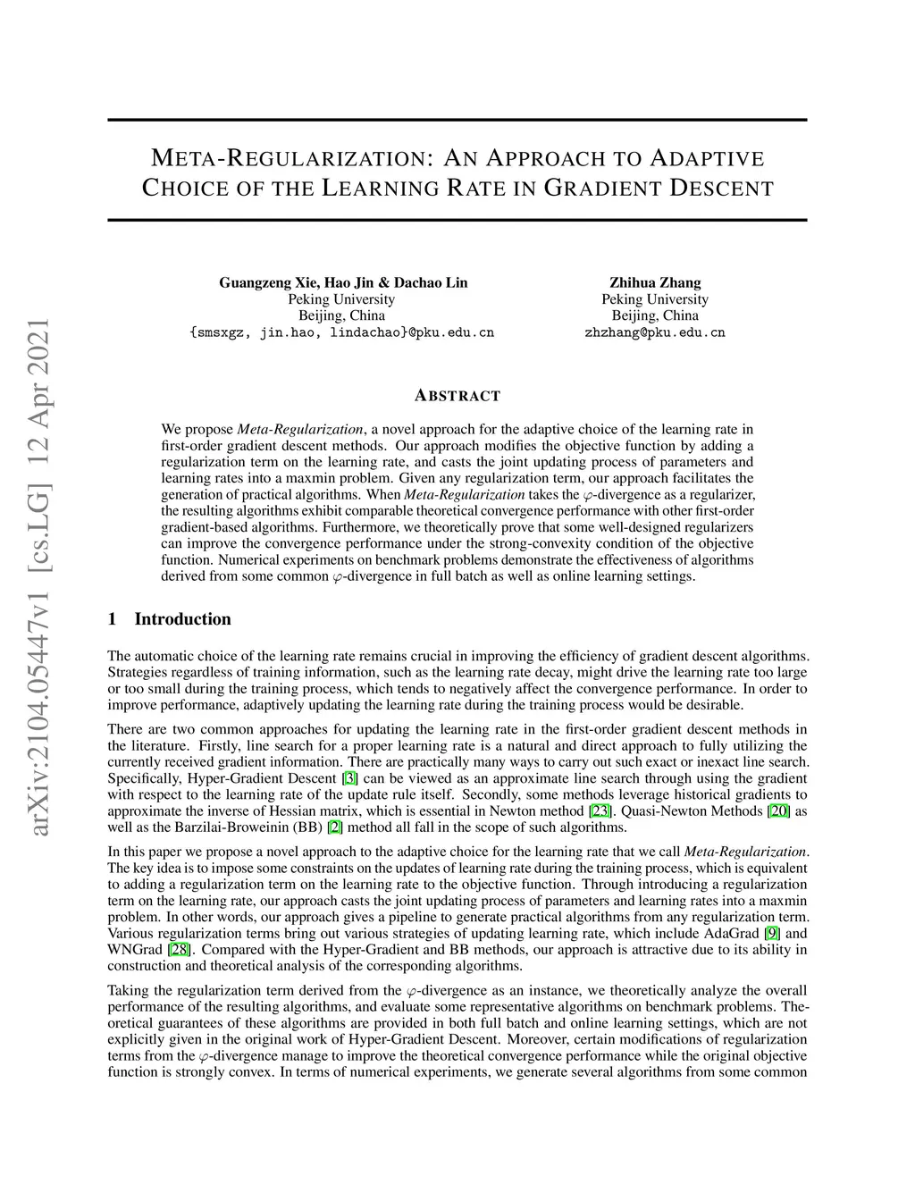 We propose \textit{Meta-Regularization}, a novel approach for the adaptive choice of the learning rate in first-order gradient descent methods. Our approach modifies the objective function by adding a regularization term on the learning rate, and casts the joint updating process of parameters and learning rates into a maxmin problem. Given any regularization term, our approach facilitates the generation of practical algorithms. When \textit{Meta-Regularization} takes the -divergence as a regularizer, the resulting algorithms exhibit comparable theoretical convergence performance with other first-order gradient-based algorithms. Furthermore, we theoretically prove that some well-designed regularizers can improve the convergence performance under the strong-convexity condition of the objective function. Numerical experiments on benchmark problems demonstrate the effectiveness of algorithms derived from some common -divergence in full batch as well as online learning settings.