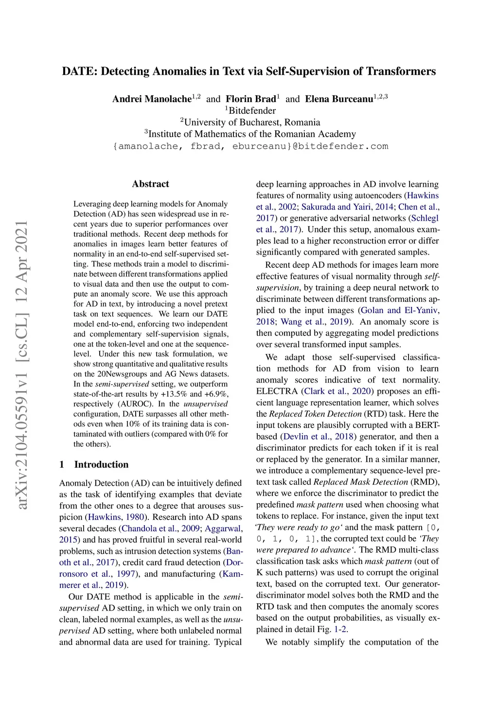 Leveraging deep learning models for Anomaly Detection (AD) has seen widespread use in recent years due to superior performances over traditional methods. Recent deep methods for anomalies in images learn better features of normality in an end-to-end self-supervised setting. These methods train a model to discriminate between different transformations applied to visual data and then use the output to compute an anomaly score. We use this approach for AD in text, by introducing a novel pretext task on text sequences. We learn our DATE model end-to-end, enforcing two independent and complementary self-supervision signals, one at the token-level and one at the sequence-level. Under this new task formulation, we show strong quantitative and qualitative results on the 20Newsgroups and AG News datasets. In the semi-supervised setting, we outperform state-of-the-art results by +13.5% and +6.9%, respectively (AUROC). In the unsupervised configuration, DATE surpasses all other methods even when 10% of its training data is contaminated with outliers (compared with 0% for the others).