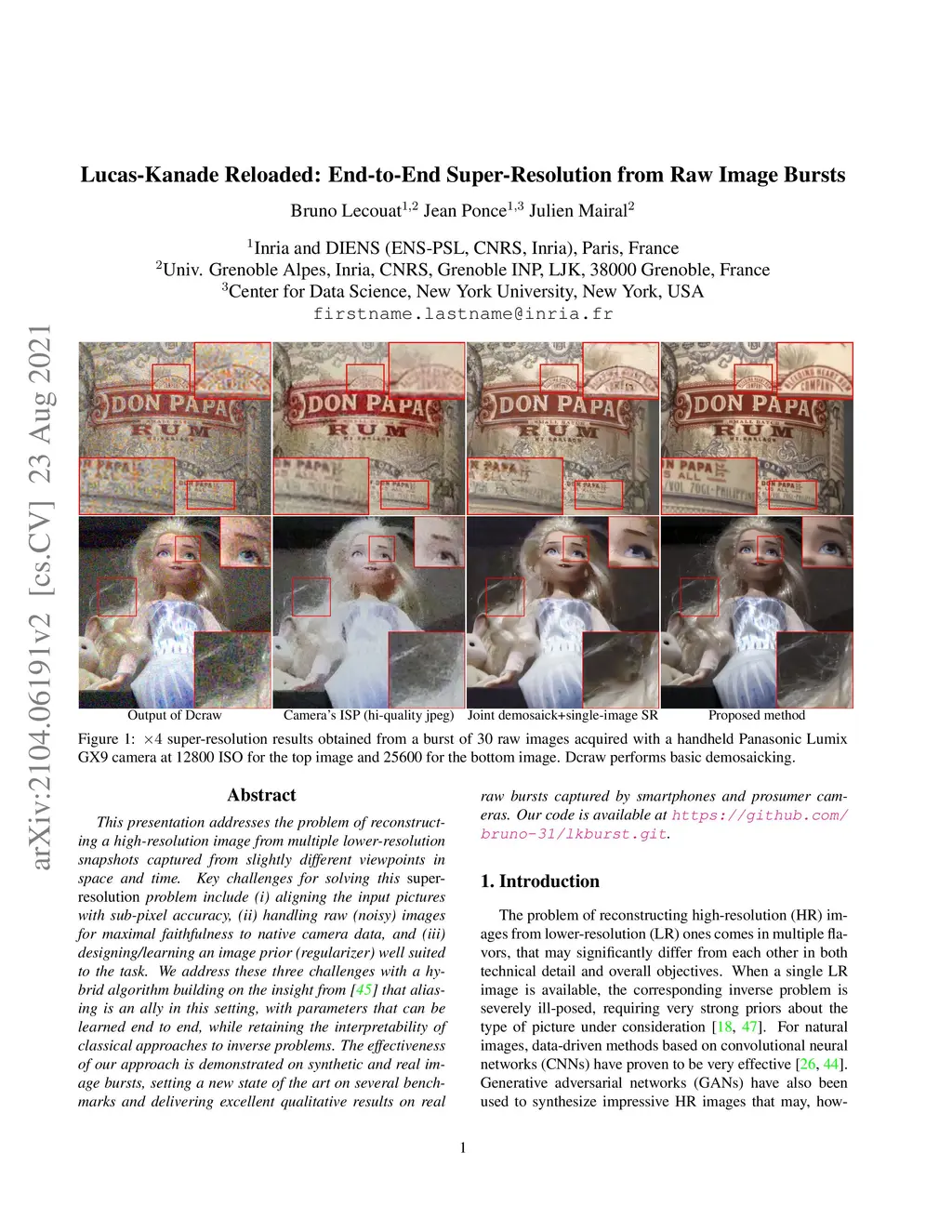 This presentation addresses the problem of reconstructing a high-resolution image from multiple lower-resolution snapshots captured from slightly different viewpoints in space and time. Key challenges for solving this problem include (i) aligning the input pictures with sub-pixel accuracy, (ii) handling raw (noisy) images for maximal faithfulness to native camera data, and (iii) designing/learning an image prior (regularizer) well suited to the task. We address these three challenges with a hybrid algorithm building on the insight from Wronski et al. that aliasing is an ally in this setting, with parameters that can be learned end to end, while retaining the interpretability of classical approaches to inverse problems. The effectiveness of our approach is demonstrated on synthetic and real image bursts, setting a new state of the art on several benchmarks and delivering excellent qualitative results on real raw bursts captured by smartphones and prosumer cameras.