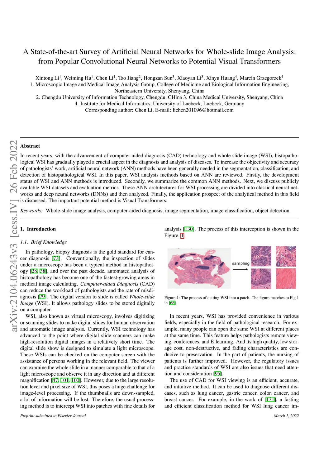 To increase the objectivity and accuracy of pathologists' work, artificial neural network(ANN) methods have been generally needed in the segmentation, classification, and detection of histopathological WSI. In this paper, WSI analysis methods based on ANN are reviewed. Firstly, the development status of WSI and ANN methods is introduced. Secondly, we summarize the common ANN methods. Next, we discuss publicly available WSI datasets and evaluation metrics. These ANN architectures for WSI processing are divided into classical neural networks and deep neural networks(DNNs) and then analyzed. Finally, the application prospect of the analytical method in this field is discussed. The important potential method is Visual Transformers.