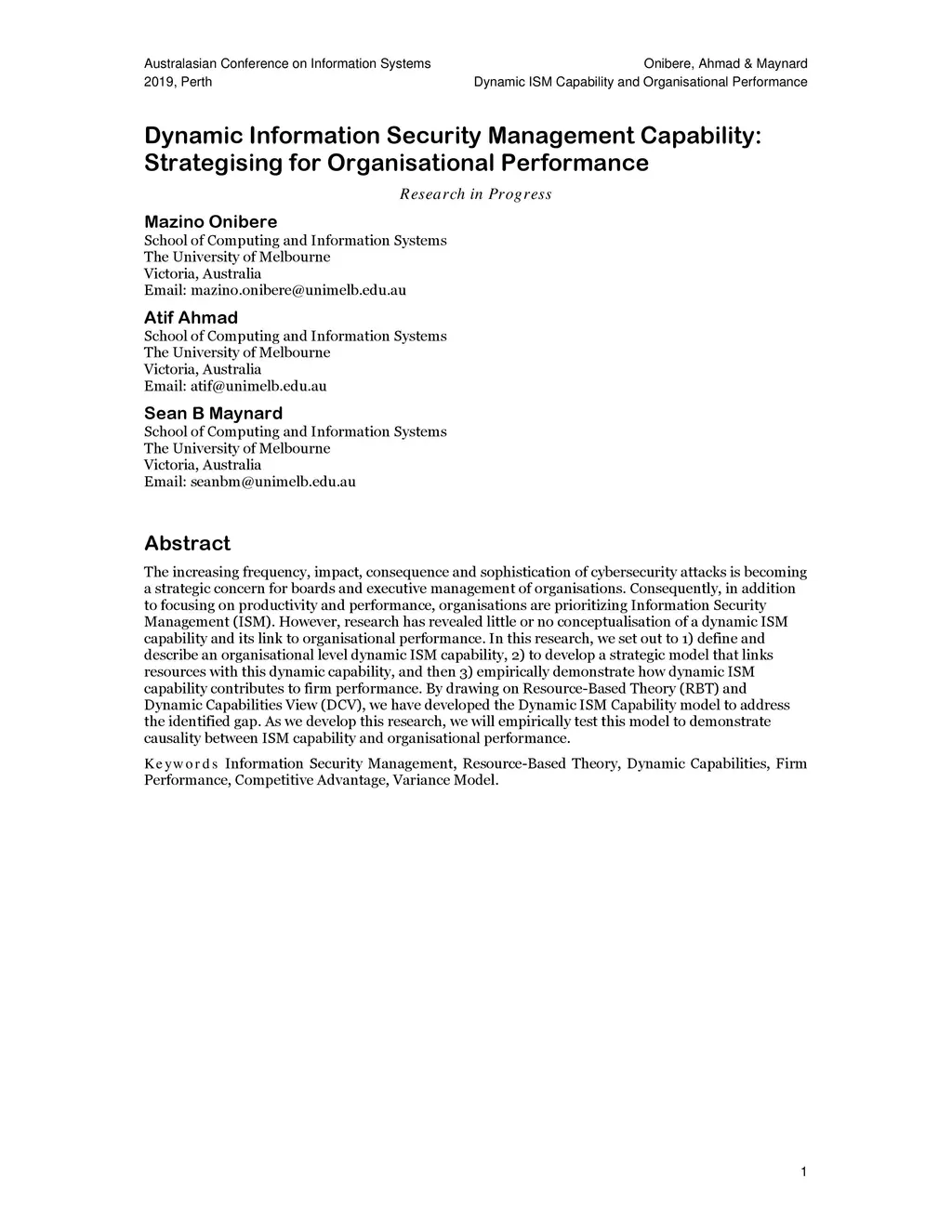 The increasing frequency, impact, consequence and sophistication of cybersecurity attacks is becoming a strategic concern for boards and executive management of organisations. Consequently, in addition to focusing on productivity and performance, organisations are prioritizing Information Security Management (ISM). However, research has revealed little or no conceptualisation of a dynamic ISM capability and its link to organisational performance. In this research, we set out to 1) define and describe an organisational level dynamic ISM capability, 2) to develop a strategic model that links resources with this dynamic capability, and then 3) empirically demonstrate how dynamic ISM capability contributes to firm performance. By drawing on Resource-Based Theory (RBT) and Dynamic Capabilities View (DCV), we have developed the Dynamic ISM Capability model to address the identified gap. As we develop this research, we will empirically test this model to demonstrate causality between ISM capability and organisational performance.