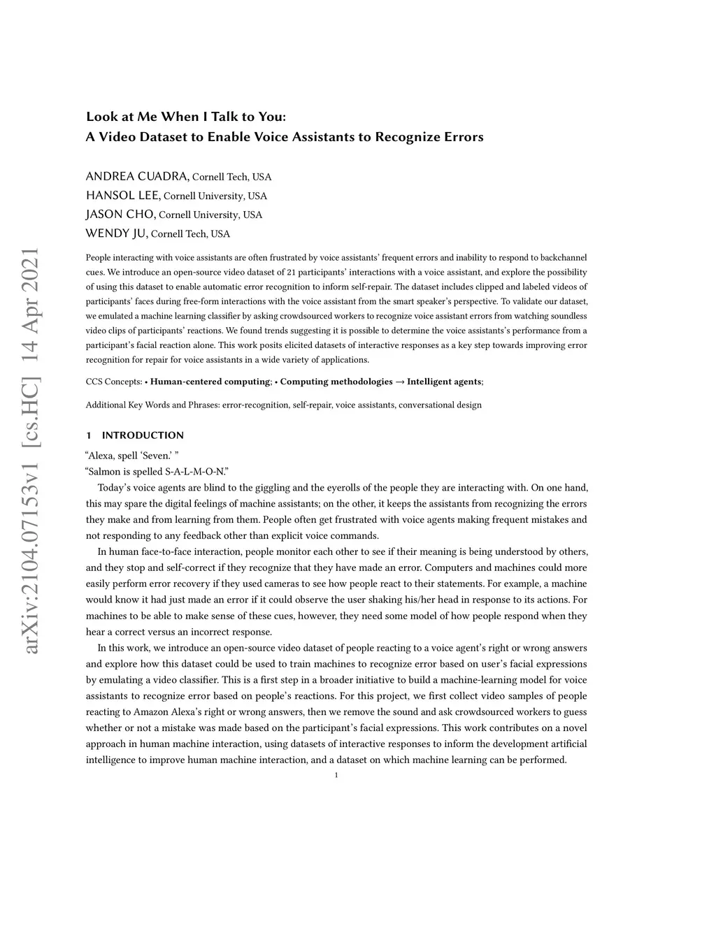 People interacting with voice assistants are often frustrated by voice assistants' frequent errors and inability to respond to backchannel cues. We introduce an open-source video dataset of 21 participants' interactions with a voice assistant, and explore the possibility of using this dataset to enable automatic error recognition to inform self-repair. The dataset includes clipped and labeled videos of participants' faces during free-form interactions with the voice assistant from the smart speaker's perspective. To validate our dataset, we emulated a machine learning classifier by asking crowdsourced workers to recognize voice assistant errors from watching soundless video clips of participants' reactions. We found trends suggesting it is possible to determine the voice assistant's performance from a participant's facial reaction alone. This work posits elicited datasets of interactive responses as a key step towards improving error recognition for repair for voice assistants in a wide variety of applications.