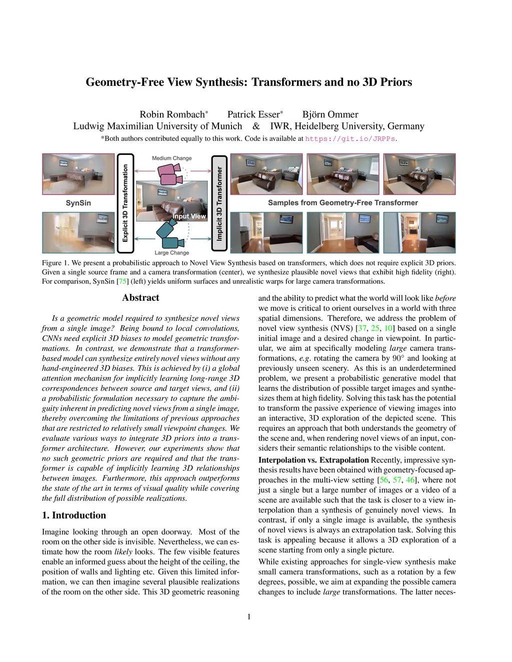 Is a geometric model required to synthesize novel views from a single image? Being bound to local convolutions, CNNs need explicit 3D biases to model geometric transformations. In contrast, we demonstrate that a transformer-based model can synthesize entirely novel views without any hand-engineered 3D biases. This is achieved by (i) a global attention mechanism for implicitly learning long-range 3D correspondences between source and target views, and (ii) a probabilistic formulation necessary to capture the ambiguity inherent in predicting novel views from a single image, thereby overcoming the limitations of previous approaches that are restricted to relatively small viewpoint changes. We evaluate various ways to integrate 3D priors into a transformer architecture. However, our experiments show that no such geometric priors are required and that the transformer is capable of implicitly learning 3D relationships between images. Furthermore, this approach outperforms the state of the art in terms of visual quality while covering the full distribution of possible realizations. Code is available at https://git.io/JOnwn