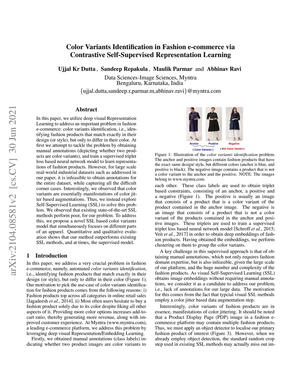 In this paper, we utilize deep visual Representation Learning to address an important problem in fashion e-commerce: color variants identification, i.e., identifying fashion products that match exactly in their design (or style), but only to differ in their color. At first we attempt to tackle the problem by obtaining manual annotations (depicting whether two products are color variants), and train a supervised triplet loss based neural network model to learn representations of fashion products. However, for large scale real-world industrial datasets such as addressed in our paper, it is infeasible to obtain annotations for the entire dataset, while capturing all the difficult corner cases. Interestingly, we observed that color variants are essentially manifestations of color jitter based augmentations. Thus, we instead explore Self-Supervised Learning (SSL) to solve this problem. We observed that existing state-of-the-art SSL methods perform poor, for our problem. To address this, we propose a novel SSL based color variants model that simultaneously focuses on different parts of an apparel. Quantitative and qualitative evaluation shows that our method outperforms existing SSL methods, and at times, the supervised model.