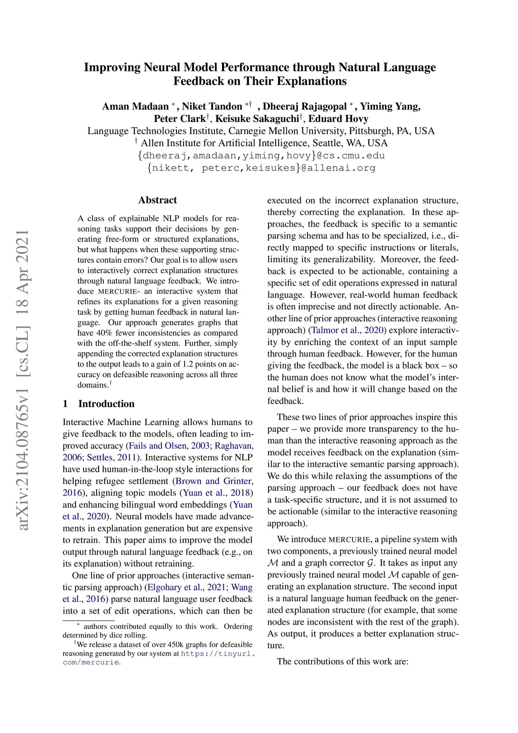 A class of explainable NLP models for reasoning tasks support their decisions by generating free-form or structured explanations, but what happens when these supporting structures contain errors? Our goal is to allow users to interactively correct explanation structures through natural language feedback. We introduce MERCURIE - an interactive system that refines its explanations for a given reasoning task by getting human feedback in natural language. Our approach generates graphs that have 40% fewer inconsistencies as compared with the off-the-shelf system. Further, simply appending the corrected explanation structures to the output leads to a gain of 1.2 points on accuracy on defeasible reasoning across all three domains. We release a dataset of over 450k graphs for defeasible reasoning generated by our system at https://tinyurl.com/mercurie .