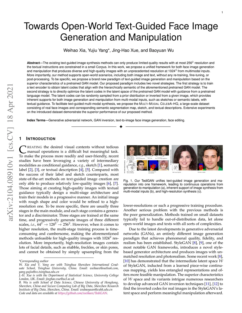 The existing text-guided image synthesis methods can only produce limited quality results with at most \mbox{} resolution and the textual instructions are constrained in a small Corpus. In this work, we propose a unified framework for both face image generation and manipulation that produces diverse and high-quality images with an unprecedented resolution at 1024 from multimodal inputs. More importantly, our method supports open-world scenarios, including both image and text, without any re-training, fine-tuning, or post-processing. To be specific, we propose a brand new paradigm of text-guided image generation and manipulation based on the superior characteristics of a pretrained GAN model. Our proposed paradigm includes two novel strategies. The first strategy is to train a text encoder to obtain latent codes that align with the hierarchically semantic of the aforementioned pretrained GAN model. The second strategy is to directly optimize the latent codes in the latent space of the pretrained GAN model with guidance from a pretrained language model. The latent codes can be randomly sampled from a prior distribution or inverted from a given image, which provides inherent supports for both image generation and manipulation from multi-modal inputs, such as sketches or semantic labels, with textual guidance. To facilitate text-guided multi-modal synthesis, we propose the Multi-Modal CelebA-HQ, a large-scale dataset consisting of real face images and corresponding semantic segmentation map, sketch, and textual descriptions. Extensive experiments on the introduced dataset demonstrate the superior performance of our proposed method. Code and data are available at https://github.com/weihaox/TediGAN.
