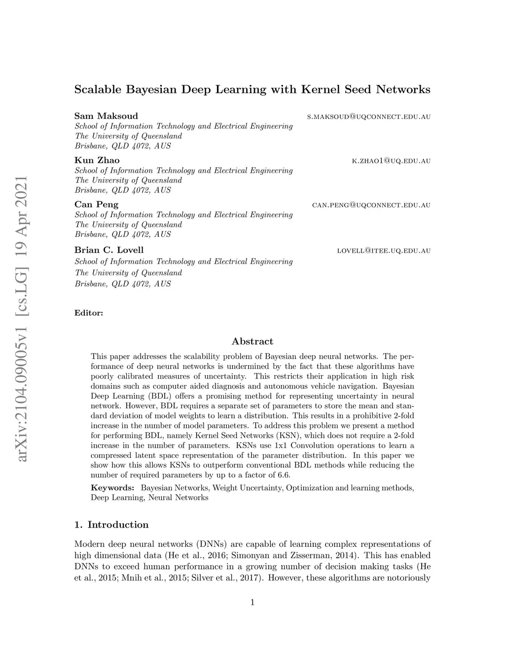 This paper addresses the scalability problem of Bayesian deep neural networks. The performance of deep neural networks is undermined by the fact that these algorithms have poorly calibrated measures of uncertainty. This restricts their application in high risk domains such as computer aided diagnosis and autonomous vehicle navigation. Bayesian Deep Learning (BDL) offers a promising method for representing uncertainty in neural network. However, BDL requires a separate set of parameters to store the mean and standard deviation of model weights to learn a distribution. This results in a prohibitive 2-fold increase in the number of model parameters. To address this problem we present a method for performing BDL, namely Kernel Seed Networks (KSN), which does not require a 2-fold increase in the number of parameters. KSNs use 1x1 Convolution operations to learn a compressed latent space representation of the parameter distribution. In this paper we show how this allows KSNs to outperform conventional BDL methods while reducing the number of required parameters by up to a factor of 6.6.