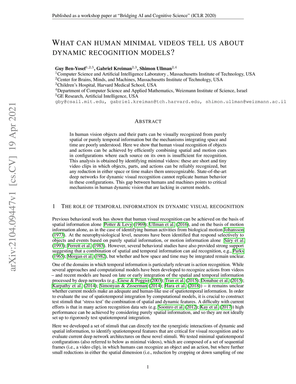 In human vision objects and their parts can be visually recognized from purely spatial or purely temporal information but the mechanisms integrating space and time are poorly understood. Here we show that human visual recognition of objects and actions can be achieved by efficiently combining spatial and motion cues in configurations where each source on its own is insufficient for recognition. This analysis is obtained by identifying minimal videos: these are short and tiny video clips in which objects, parts, and actions can be reliably recognized, but any reduction in either space or time makes them unrecognizable. State-of-the-art deep networks for dynamic visual recognition cannot replicate human behavior in these configurations. This gap between humans and machines points to critical mechanisms in human dynamic vision that are lacking in current models.